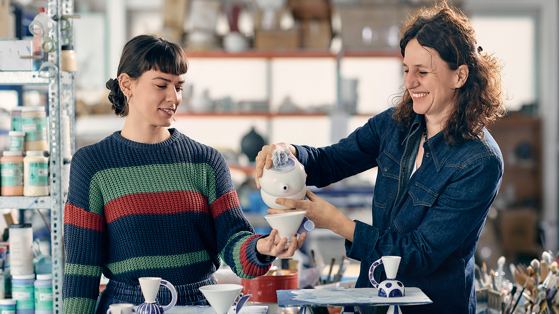 Τη ρωτώ γιατί θέλησε να ασχοληθεί με την κεραμική. «Είχα ξεκινήσει να ζωγραφίζω πάνω σε πιάτα και κάποια στιγμή συνειδητοποίησα πως αυτό δεν μου έφτανε, ήθελα να δοκιμάσω τις δικές μου φόρμες. Μου αρέσει η ιδέα ότι μπορεί να κινούμαι μεταξύ ευθραυστότητας και δύναμης, να ασχολούμαι με κάτι τόσο απτό και άμεσο, που κρύβει μέσα του και τη χαρά του παιχνιδιού».