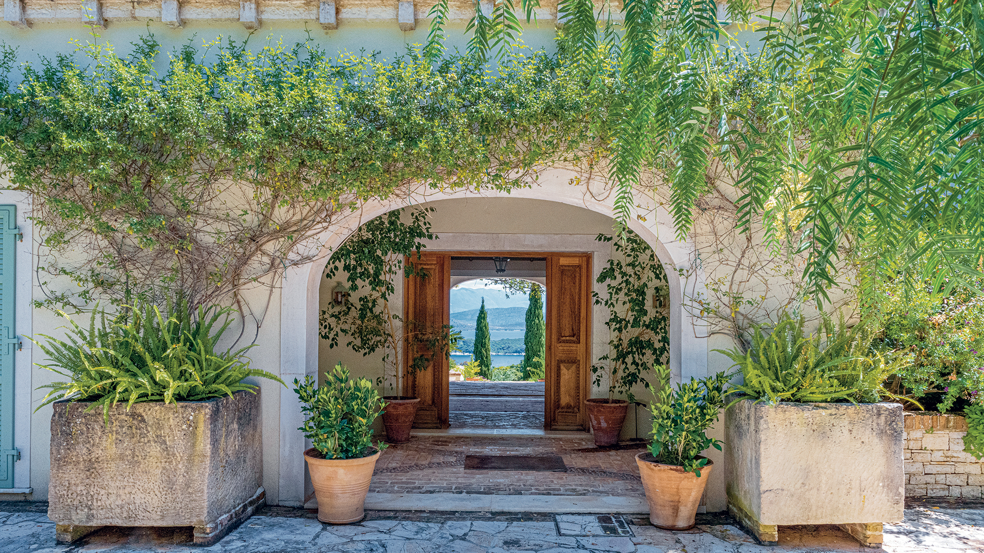 Περίπου 10 χιλιόμετρα βορειότερα, στο χωριό Κασσιόπη, συναντάμε τη Villa sto dasos· μια εμβληματική βίλα που διαθέτει ένα μεγάλο κτήμα που φέρει την υπογραφή της αρχιτέκτονα τοπίου Αλιθέα Τζονς του γραφείου Skopos Design. Τα βρετανικής κομψότητας και τάξης αίθρια δίνουν τη θέση τους στον κερκυραϊκό ελαιώνα και εκείνος με τη σειρά του την παραχωρεί στο «άγριο» τοπίο του δάσους. Μικροσκοπικές μαργαρίτες, εντυπωσιακοί μοβ αγάπανθοι και μεγάλες δόσεις δεντρολίβανου, θυμαριού και λεβάντας συμπληρώνουν τη μεσογειακή σύνθεση.