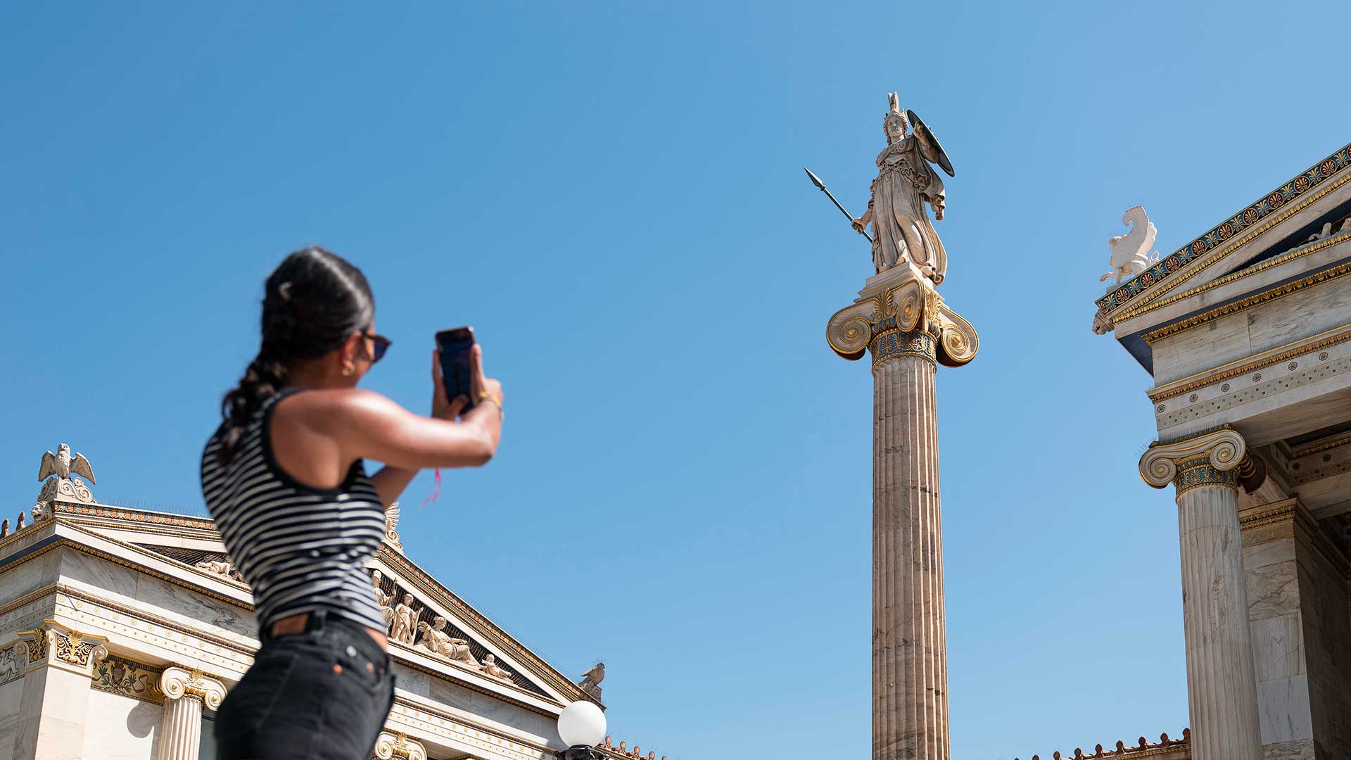 Μια κοπέλα στέκεται στον περίβολο της Ακαδημίας Αθηνών, στρέφει το κινητό της προς τον ουρανό όπου «κατοικούν οι θεοί» και απαθανατίζει την Αθηνά Πρόμαχο του Λεωνίδα Δρόση (1834-1882). Το σώμα της αρχαίας πολιούχου της πόλης που κατοικούμε, εξιδανικευμένα απεικονισμένο και γεμάτο συμβολισμούς καταπώς ορίζει το ρεύμα του κλασικισμού, ντυμένο με πέπλο γεμάτο πτυχώσεις που στο στέρνο του έχει «απλικαρισμένο» το πρόσωπο της Μέδουσας Γοργούς με τα φίδια στα μαλλιά, εκφράζει τη γυναικεία ρώμη και σπέρνει τον τρόμο στον εχθρό. Το κεφάλι της είναι στολισμένο με περικεφαλαία με λοφίο. Το δόρυ και η ασπίδα της είναι ορειχάλκινα. Φτιαγμένη από μάρμαρο σε υπερφυσικό μέγεθος –ξεπερνά τα 4 μέτρα– θωρεί την πόλη από έναν πανύψηλο κίονα ιωνικού ρυθμού με χρυσές διακοσμήσεις, εν είδει βάθρου. Το προσωνύμιό της σημαίνει «αυτή που πολεμάει στην πρώτη γραμμή της μάχης». —Π.Κ.