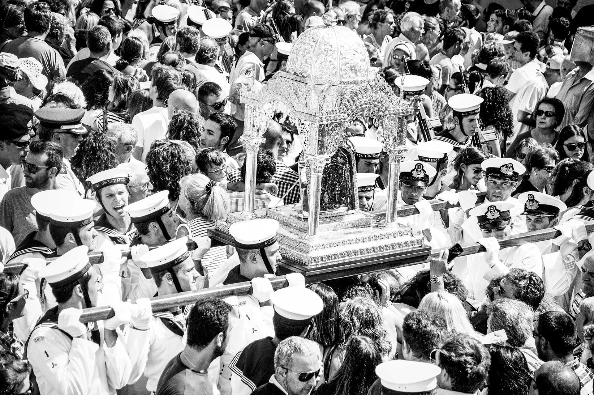 Γόνατα γδαρμένα που μεταφέρουν πάνω στις ηλιοκαμένες πέτρες μιαν ελπίδα. Μάτια παρακλητικά, βλέμματα πονεμένα. Τα πλοία, το ένα μετά το άλλο, αφήνουν το κύμα των ανθρώπων στο λιμάνι της Τήνου. Ο προορισμός αυτές τις μέρες είναι ένας: ο Ιερός Ναός Ευαγγελιστρίας της Τήνου. Για χάρη της Ιερής Εικόνας, πιστοί από όλο τον κόσμο έρχονται στο νησί ελπίζοντας σε ένα θαύμα, σε μια ανάταση ψυχών και σωμάτων.