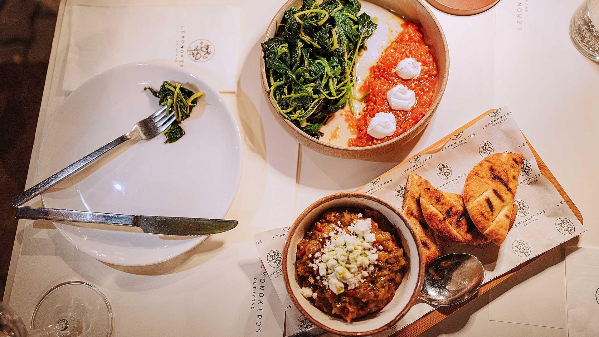 Δοκιμάζουμε άψογα βρασμένα βλίτα με γαλένι και τριμμένη ντομάτα σε ένα από τα πιάτα-σύμβολα του ελληνικού καλοκαιριού, τραγανό καλαμάρι τηγανητό, που είναι από μόνο του στολίδι μες στο πιάτο του και σερβίρεται με έναν ωραιότατο ταραμά, αλλά και καπνιστή μελιτζανοσαλάτα με πιπεριά Φλωρίνης και βαρελίσια φέτα, ευγενικά καπνισμένη και καρυκευμένη έτσι που η γλυκιά μελιτζάνα να δίνει ρεσιτάλ. Στα τραπεζάκια του Λεμονόκηπου σερβίρεται και ένα ρουαγιάλ πιλάφι (το γνωστό γαμοπίλαφο) με ζυγούρι και γιαούρτι. Απαλό, πληθωρικό, ολόγευστο αλλά και συνάμα κομψό, το σπουδαιότερο από τα σπουδαία πιάτα της κρητικής κουζίνας, έρχεται άψογα μαγειρεμένο, κρεμώδες και με λεμονάτη σπιρτάδα, με το γιαούρτι να αγκαλιάζει την μπουκιά σαν ένα κομμάτι πολυτελές μεταξωτό ύφασμα.