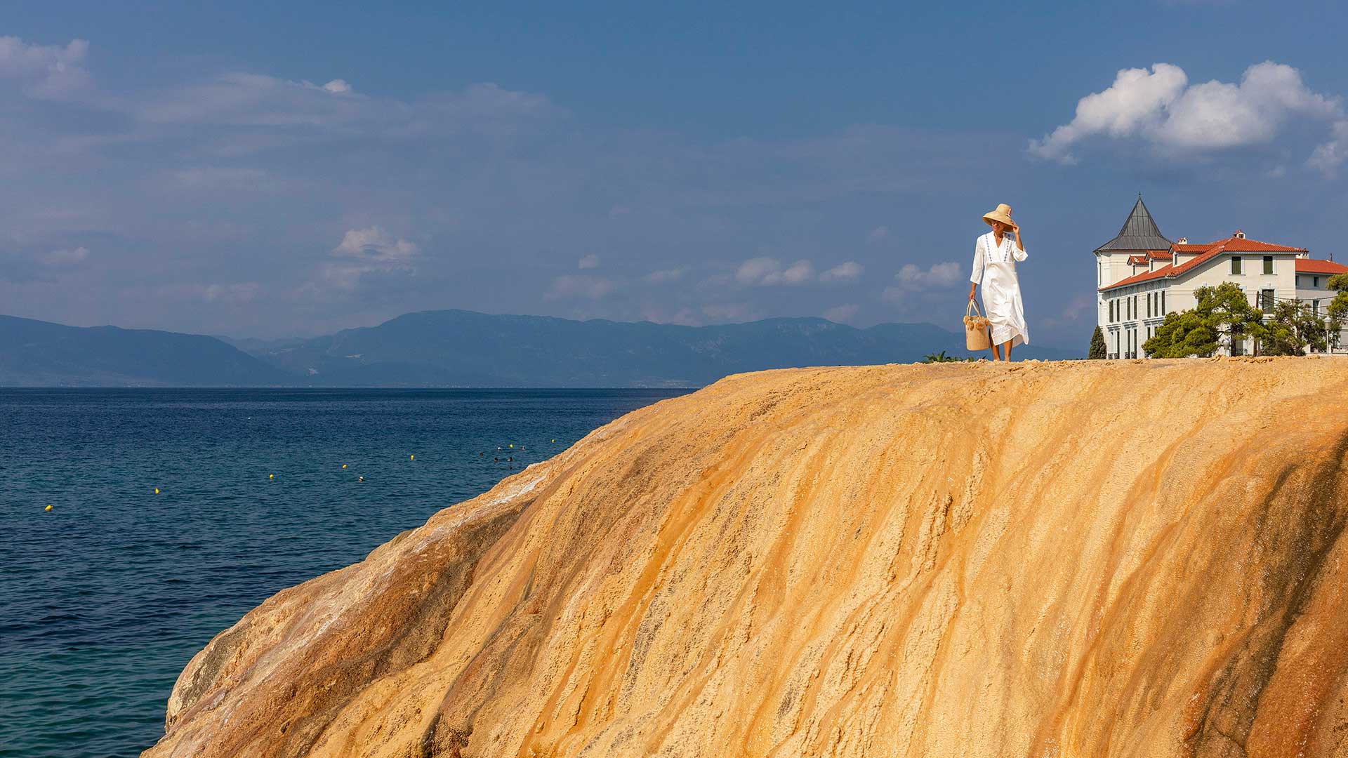 Μπαίνω πρώτα στη θάλασσα με βήμα δειλό, όπως όλα τα άτομα που δεν είναι μαθημένα να περπατούν σε βοτσαλωτές ακτές, δροσίζομαι λίγο και ύστερα βγαίνω έξω, για να σταθώ στην άκρη του βράχου, όπου πέφτει καταρρακτωδώς ιαματικό νερό. Υπάρχει μια μικρή ουρά αναμονής. Επικρατεί ένας άγραφος κανόνας, που θέλει τους λουόμενους να σέβονται την πολυκοσμία και να μην κάνουν κατάχρηση του χρόνου. Πλησιάζω το νερό διστακτικά, μήπως είναι υπερβολικά καυτό, και ύστερα στέκομαι στον κίτρινο βράχο. Ο ορισμός της χαλάρωσης.