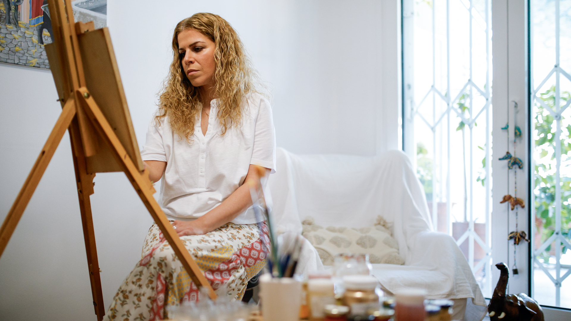 Πριν την αποχαιρετήσω, της ζητώ να ζωγραφίσει κάτι που θα αποτυπώνει την τωρινή φάση ζωής της. «Θα ζωγράφιζα το πρόσωπο της κόρης μου να με κοιτάζει πονηρά πριν κάνει τη σκανταλιά!» μου λέει χαμογελώντας. «Το φαντάζομαι με ροζ και ανθρακί αποχρώσεις. Ίσως να έβαζα και λίγο ασπροκίτρινο στο φόντο…».