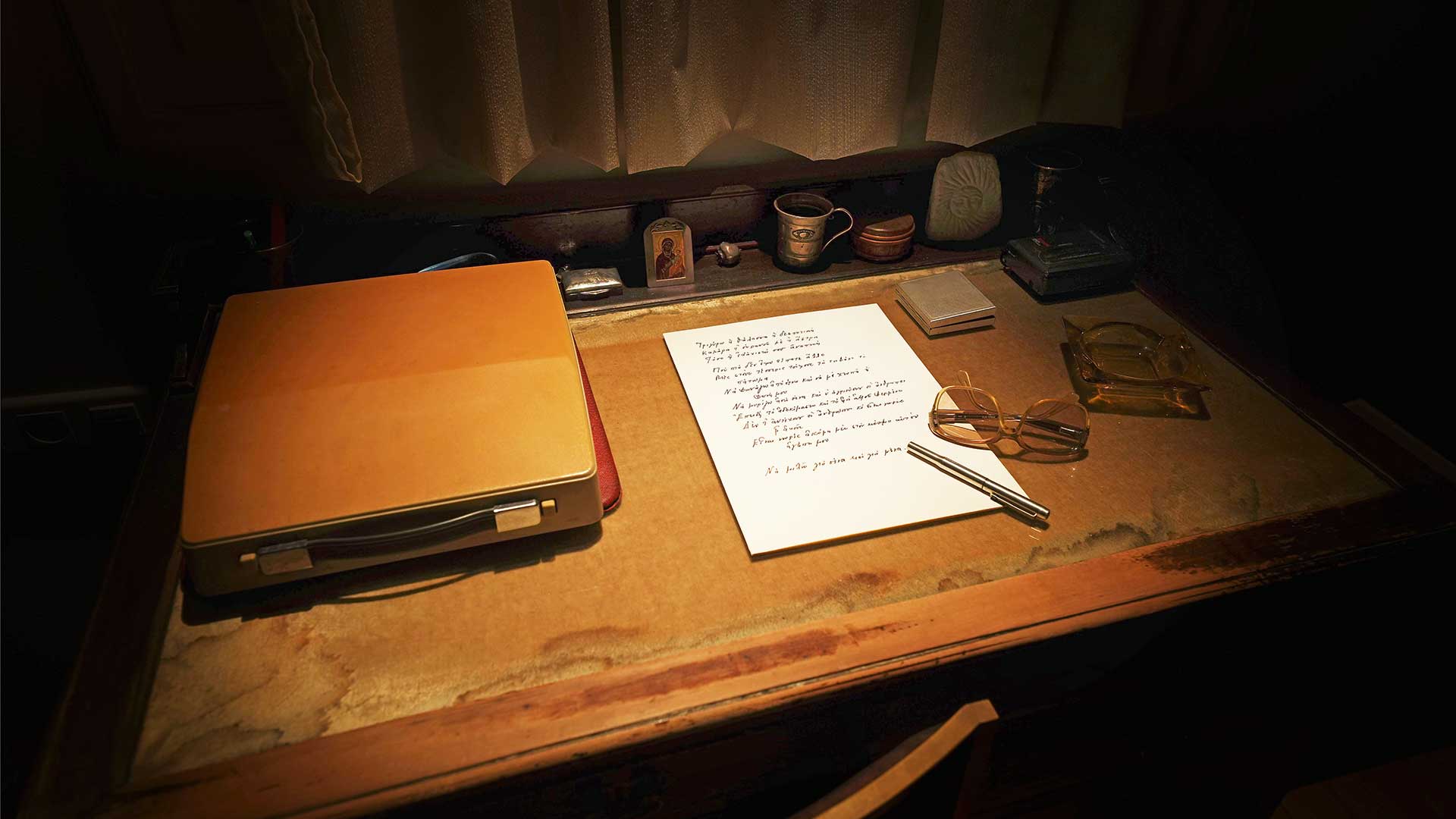 Στο ισόγειο υπάρχει κι ένας δεύτερος χώρος. Σχεδόν μεταφυσικά ο επισκέπτης μεταφέρεται σε ένα άλλο μέρος, σε μια άλλη εποχή, βρίσκεται ξαφνικά στο σαλόνι του Οδυσσέα Ελύτη στο σπίτι του στο Κολωνάκι – η αναπαράσταση είναι πιστή. Ο καναπές, το γραφείο, η βιβλιοθήκη, τα αντικείμενα, οι πίνακες, ακόμα και το παράθυρο, βρίσκονται στο σωστό σημείο. «Συχνά ξεχνώ το σύνολο του μουσείου όταν βρίσκομαι εκεί, νομίζω ότι βρίσκομαι στο σπίτι», λέει η κ. Ηλιοπούλου. «Η πιστότητα του χώρου και τα ίδια τα αντικείμενα με τα οποία έχω συζήσει δημιουργούν αυτή την αίσθηση. Γι’ αυτό και συνήθως αφήνω τον επισκέπτη να κινηθεί μόνος του και δεν προχωρώ πιο μέσα». Ποια είναι η πρώτη εικόνα που της έρχεται στο μυαλό; τη ρωτάω. «Η εικόνα του ίδιου του Ελύτη να δουλεύει», μου λέει. «Να σπρώχνει την καρέκλα του για να σηκωθεί από το γραφείο του, μετά να ξανακάθεται για να γράψει».