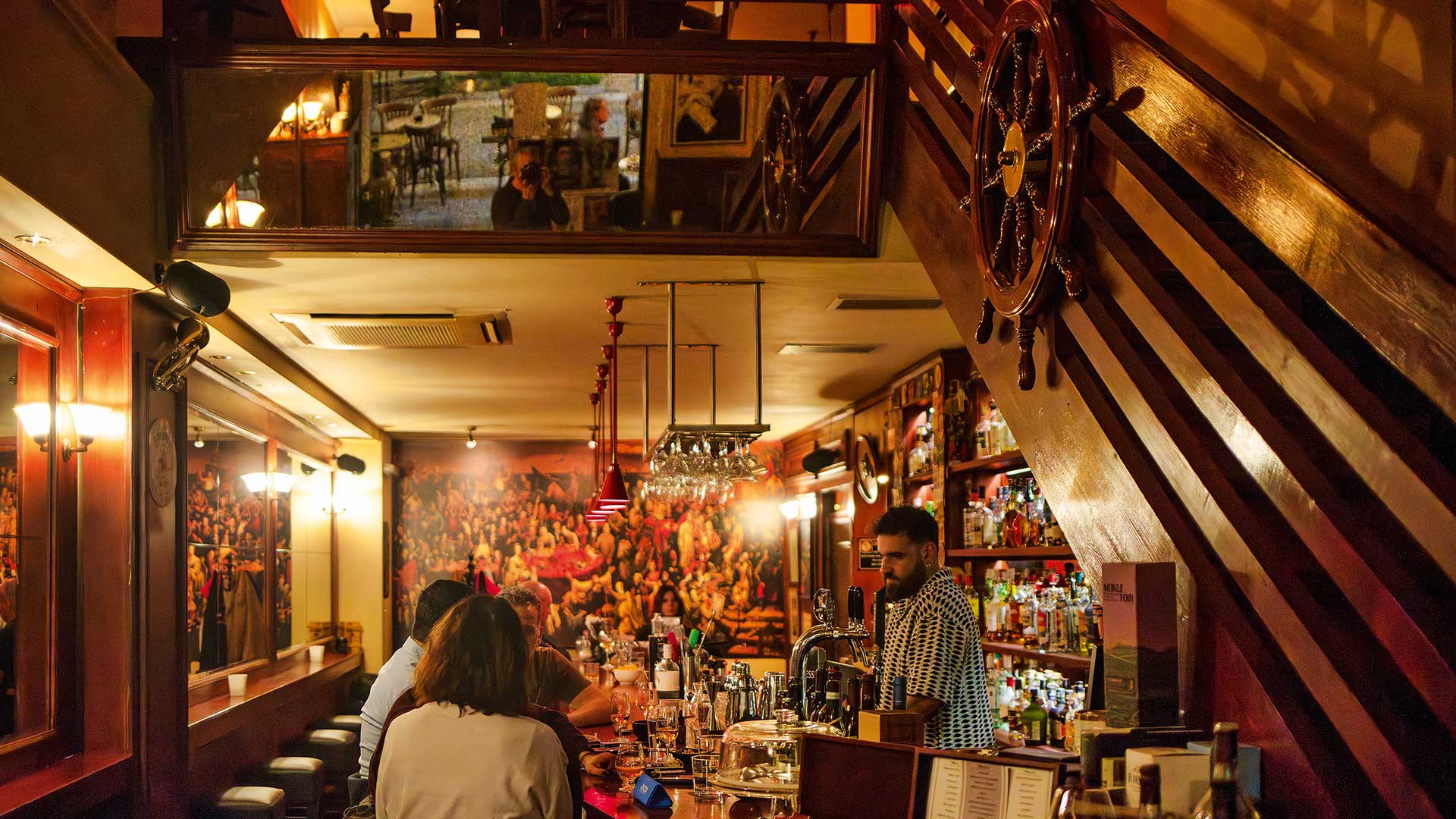 Η ιστορία του ξεκινά στις αρχές του ’80, όταν ο Γιάννης Μουστακαριάς είχε το πρώτο ομώνυμο στέκι στην Καστέλλα. Σήμερα, στο στενάκι της οδού Αριστοτέλους, τη σκυτάλη κρατούν ο γιος του, Αδαμάντιος, με τον ξάδερφό του Γιάννη Χρυσόγελο και τον φίλο τους Βαγγέλη Δαρούσο. Πρόκειται για ένα old school μπαρ, στιλιστικά δεν μοιάζει σίγουρα με όσα άνοιξαν πριν από δέκα χρόνια. Ξύλο παντού, παλιά αντικείμενα, σουβέρ από ταξίδια φίλων στον κόσμο και στο βάθος μια ταπετσαρία που τραβάει το βλέμμα. Απεικονίζει το έργο Συζητώντας τη Θεία Κωμωδία με τον Δάντη, μια φανταστική συνάντηση στον «άλλο κόσμο», όπου πάνω από 100 ιστορικές προσωπικότητες, από τον Ναπολέοντα και τον Λεονάρντο ντα Βίντσι μέχρι τον Αϊνστάιν, συνυπάρχουν σε έναν κοινό χώρο και κάνουν μια ατελείωτη συζήτηση. Σαν να βρίσκονταν σε ένα τέτοιο μπαρ, που σε προσκαλεί να κουβεντιάσεις, να στοχαστείς. Στη σκάλα που οδηγεί στο πατάρι βρίσκεται ένα τιμόνι πλοίου. «Δεν γίνεται ένα μπαρ στο λιμάνι να μην έχει κάτι θαλασσινό», λέει σήμερα ο Γιάννης.