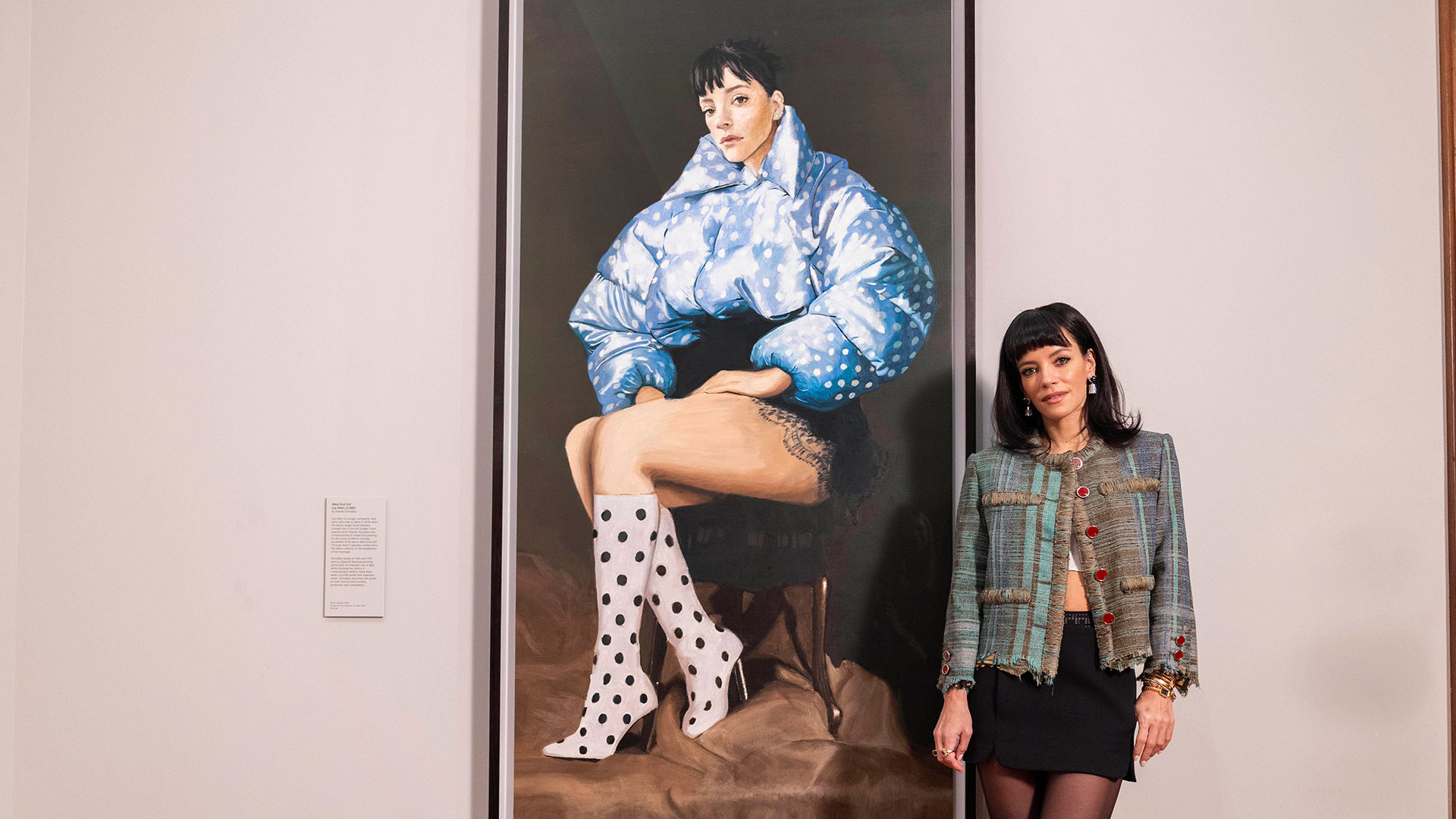 «Πολύ πουά», σκέφτομαι κοιτώντας το υπερμεγέθες πορτραίτο της Λίλι Άλεν. Η εικόνα «έπαιξε» δεκάδες φορές στην οθόνη του κινητού μου τους προηγούμενους μήνες, καθώς άκουγα επανειλημμένα τον τελευταίο της δίσκο, «West End Girl», αλλά ποτέ δεν την είχα δώσει τρομερή σημασία στις λεπτομέρειες. Η διάσταση 89×99 με βοηθάει. Λάδι σε καμβά, μπαρόκ αναφορές, ένα θαλασσί πουά φουσκωτό μπουφάν, ένα μαύρο δαντελένιο νεγκλιζέ και ασπρόμαυρες μπότες με βούλες. Κάπως έτσι μοιάζει ο πίνακας για το εξώφυλλο του «West End Girl» που αυτή τη στιγμή εκτίθεται –στο κανονικό του μέγεθος και όχι στο κροπαρισμένο του Spotify– στην Εθνική Πινακοθήκη του Λονδίνου.