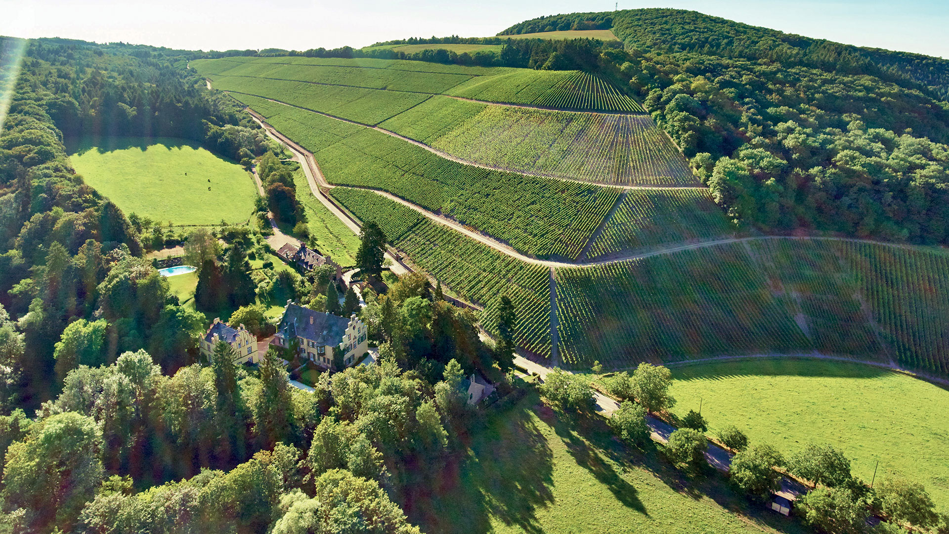 Ο αμπελώνας των 34 εκταρίων στις επιβλητικές, απότομες πλαγιές, με κλίσεις που αγγίζουν το 75%, χωρίζεται σε τρία αμπελοτόπια, με διαφοροποιήσεις στο terroir, οι οποίες αποτυπώνονται και στα κρασιά του κτήματος. Τα τρία αυτά «cru», αποτελούν «μονοπώλιο», γεγονός εξαιρετικά σπάνιο, καθώς ανήκουν και καλλιεργούνται αποκλειστικά από το οινοποιείο Maximin Grünhaus. Το Riesling καλύπτει το 90% των φυτεύσεων, ενώ ανάμεσα στα κλήματα καλλιεργούνται άγρια βότανα και χόρτα. To οινοποιείο βρίσκεται στους πρόποδες του λόφου κι εκεί τα κρασιά ωριμάζουν σε βαρέλια φτιαγμένα από δρυ του κοντινού δάσους Grünhäuser. Tα κρασιά του Maximin Von Schubert φημίζονται για την κομψότητα, τα πικάντικα στοιχεία και την εκπληκτική δυνατότητα παλαίωσής τους.