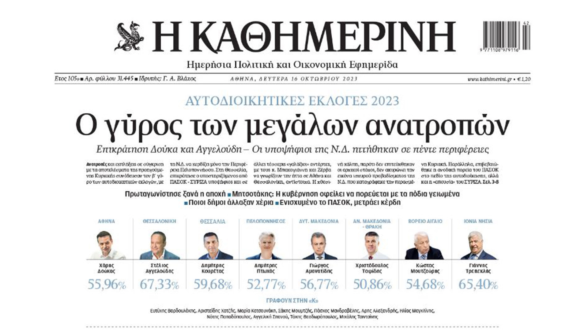 Με ένα έκτακτο φύλλο 24 σελίδων η «Κ» σήμερα καταγράφει τα αποτελέσματα και τον απόηχο του δεύτερου γύρου των αυτοδιοικητικών εκλογών.