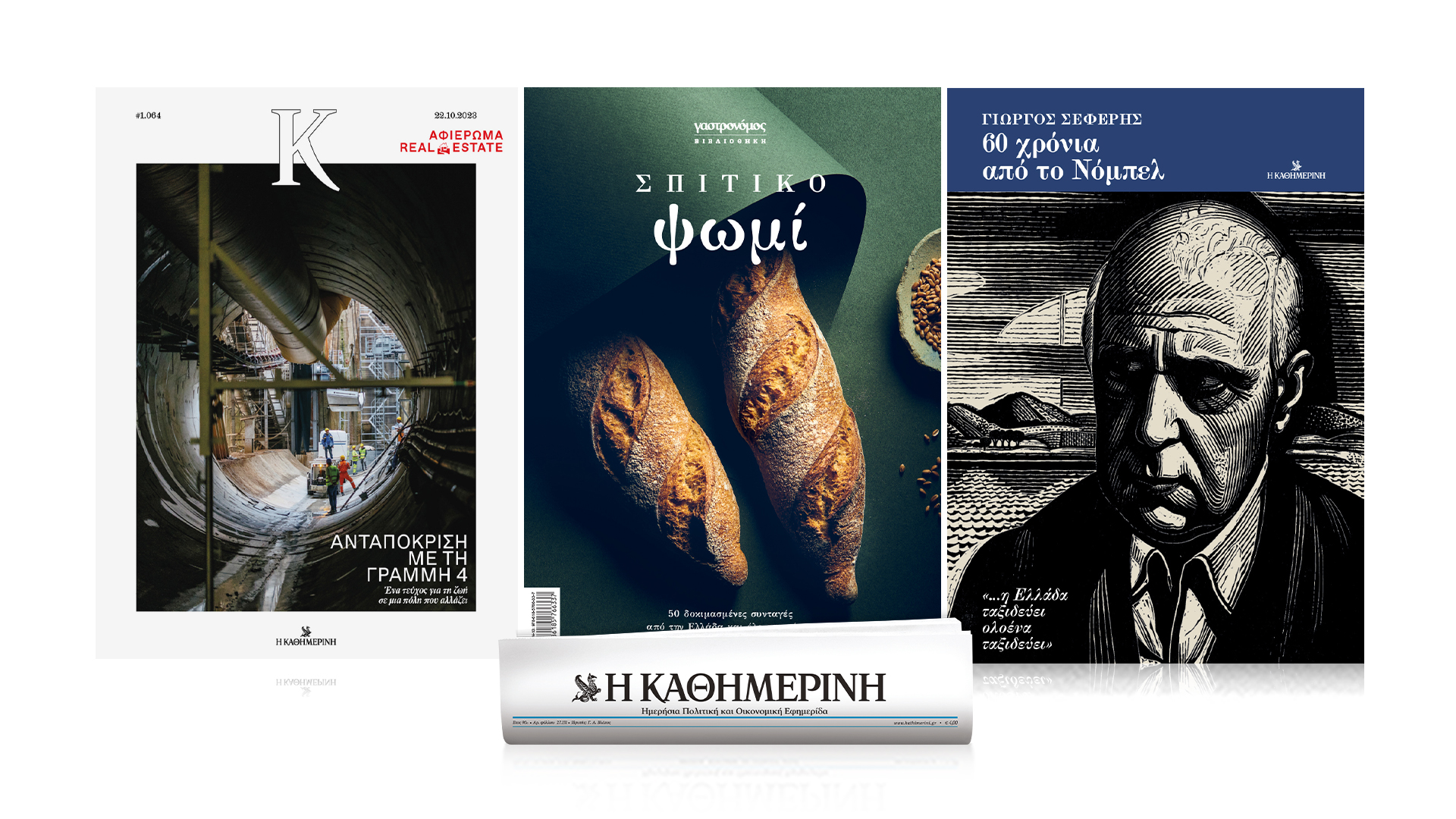«Σπιτικό ψωμί», το πιο ζεστό, μοσχοβολιστό βιβλίο έρχεται από τον γαστρονόμο, με 50 δοκιμασμένες συνταγές από την Ελλάδα και τον κόσμο. Γρήγορα ψωμάκια μπύρας, σκορδοψωμάκια γεμιστά με μυρωδικά και τυριά, με ξηρούς καρπούς, μπριός και μπέιγκελς , χωριάτικα, προζυμένια, αλλά και χωρίς γλουτένη. Ακόμα αποκτήστε τη συλλεκτική έκδοση «Γιώργος Σεφέρης: 60 χρόνια από το Νόμπελ» με πλούσια εικονογράφηση για τη ζωή και το έργο του μεγάλου ποιητή, επιλεγμένα ποιήματα αλλά και τα σκίτσα του, ενώ με το περιοδικό «Κ» αυτής της Κυριακής, ζήστε σε μία πόλη που συνεχώς αλλάζει. Το «Κ» κατέβηκε σε βάθος 30 μέτρων από την επιφάνεια της γης, έκανε βόλτα με μία ομάδα καλλιτεχνών από το Χονγκ Κονγκ, έκανε πατίνι, ποδήλατο, ρόλερς και επισκέφθηκε τον Κολωνό.