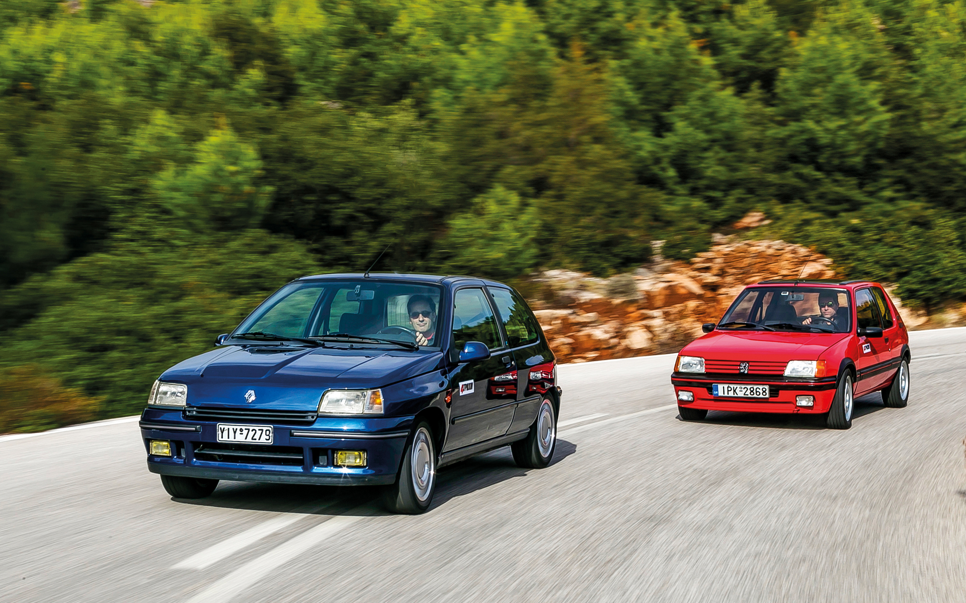Ταξίδι στο παρελθόν, με αυτοκίνητα της κλάσης GTi, πίσω από το τιμόνι του «μεγάλου» Peugeot 205 1.9 και του Renault Clio 1.8 16V. Απολαμβάνουμε δύο άψογα συντηρημένα καθαρόαιμα GTi της γαλλικής σχολής σε παλιές, κλασικές ειδικές διαδρομές της Αττικής. Το κόκκινο GTi με την ένδειξη «1.9» το κοιτάζεις, υποκλίνεσαι και παραδίνεσαι. Περήφανο πάνω στους τροχούς των 15 ιντσών, ενώ επιτέλους ένα άνετο κατώφλι σε οδηγεί στο προσεγμένο εσωτερικό του. Έχουν περάσει πολλά χρόνια από την πρώτη μας φορά με GΤi, και οι μνήμες έρχονται στην επιφάνεια καθώς περιστρέφουμε το διακόπτη της μίζας. Πραγματικά είναι αξεπέραστος ο ήχος του 8βάλβιδου κινητήριου συνόλου. Μένει να συνηθίσεις τον αρκετά βαρύ συμπλέκτη. Από εκεί και πέρα ξεδιπλώνεται μια απολαυστική εμπειρία, χάρη στο ελαφρύ αμάξωμα και στο ακριβές αλλά και γρήγορο τιμόνι.