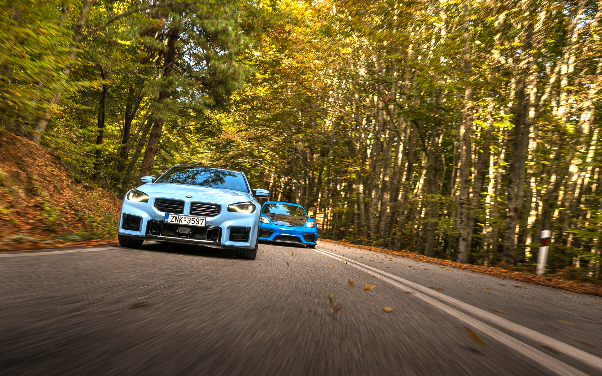 Τέτοια εποχή θέλεις δυνατό άλλοθι για το «Αθήνα-Θεσσαλονίκη/Χαλκιδική-Aθήνα», και μάλιστα αυθημερόν. Καταστροφικός ο υπολογισμός σε καύσιμα και διόδια, αλλά χαλάλι, όπως αποδείχθηκε. Πόσω μάλλον, με δεδομένο ότι μας δόθηκε η ευκαιρία να αντιπαρατάξουμε απέναντι στη νέα BMW M2 μια Porsche Cayman 718 GT4 RS.
