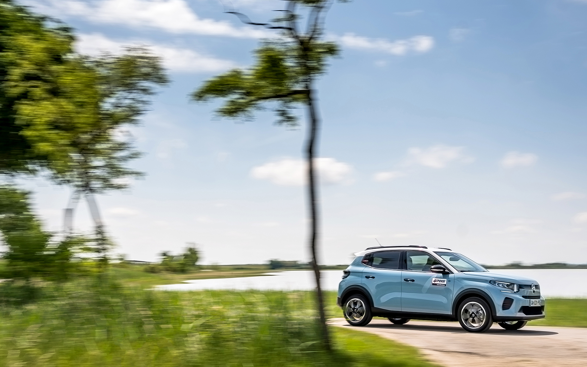 Εν προκειμένω, για την γκάμα του C3 η Citroen επέλεξε ως βάση τον 1.200άρη Puretech με απόδοση 100 ίππους και στάνταρντ χειροκίνητο 6άρι κιβώτιο. Πιο πάνω τοποθετείται μία υβριδική παραλλαγή αλά Peugeot 208, επίσης με 100 ίππους και με το αυτόματο κιβώτιο διπλού συμπλέκτη e-DCS6 (θα ακολουθήσει το φθινόπωρο), αλλά και δύο ηλεκτρικές. Προς το παρόν δεν ανακοινώνονται στοιχεία για το μικρότερο e-C3, πλην του ότι θα έχει αυτονομία 200 χλμ. Το μεγαλύτερο, ωστόσο, των 320 χλμ. είναι χειροπιαστό, και με αυτό πήραμε την πρώτη γεύση του μοντέλου. Προσθιοκίνητο, στο δάπεδό του φέρει μία μπαταρία LFP (φωσφορικού σιδήρου λιθίου) 44 kWh που παρέχει αυτονομία έως και 320 χλμ. Με δυνατότητα ταχείας φόρτισης DC 100 kW, μπορεί να ανακτήσει το 80% (από 20%) της χωρητικότητάς της σε 26 λεπτά, ενώ η τυπική φόρτιση εναλλασσόμενου ρεύματος από το 20% στο 80% διαρκεί περίπου 4 ώρες και 10 λεπτά με ισχύ 7 kW, ή 2 ώρες και 50 λεπτά με 11 kW. Ο κινητήρας αποδίδει 83 kW (113 ίπποι) και, σε συνδυασμό με το κιβώτιο μονής σχέσης, εξασφαλίζει επιτάχυνση για το «0-100» σε περίπου 11 δευτερόλεπτα, με την τελική ταχύτητα να περιορίζεται στα 135 χλμ./ώρα.