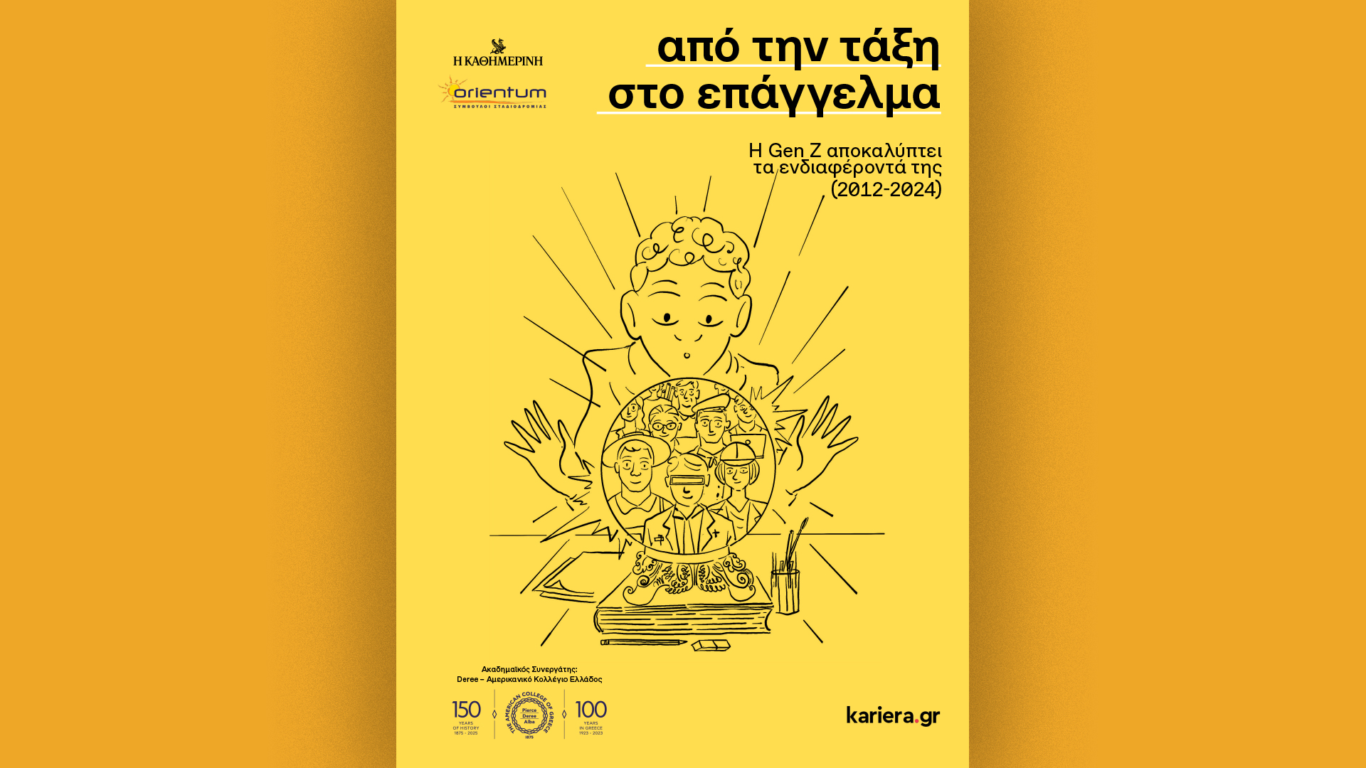 Διαβάστε περισσότερα στην έκδοση Από την τάξη στο επάγγελμα: H Gen Z αποκαλύπτει τα ενδιαφέροντά της, 2012-2024, την Κυριακή 22 Ιουνίου με την «Καθημερινή». Περιέχει και μια ειδική έκπτωση στο Ατομικό Πρόγραμμα Επαγγελματικού Προσανατολισμού, αποκλειστικά για τους αναγνώστες της «Καθημερινής».