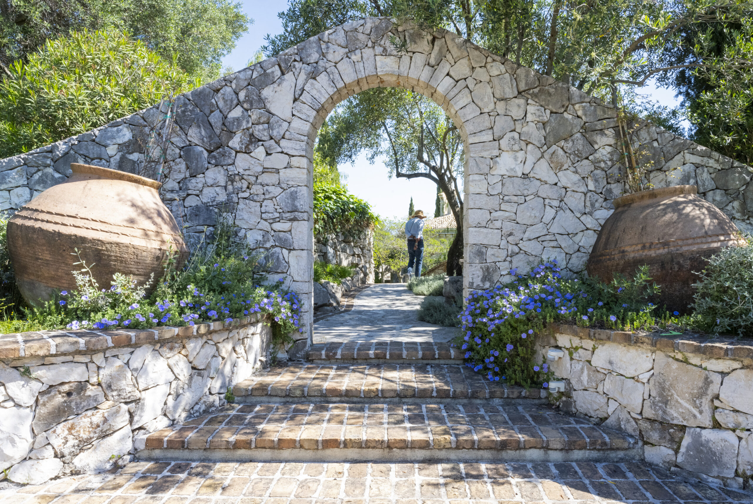 Οδηγώντας στις πλαγιές του Παντοκράτορα, του ψηλότερου βουνού του νησιού (906 μέτρα), σε δρόμους που από ένα σημείο και μετά γίνονται στενοί και χωμάτινοι, χρειάστηκε να περάσουμε μια μικρή οδηγική περιπέτεια σε ένα «αλπικό» ανοιξιάτικο τοπίο πριν φτάσουμε στον προορισμό μας. Το Rou Estate, όμως, μας αντάμειψε με την ομορφιά του. Ο εγκαταλελειμμένος οικισμός, ηλικίας 200 ετών, ο οποίος αναστηλώθηκε με μεράκι από τον Βρετανό αρχιτέκτονα Ντόμινικ Σκίνερ του γραφείου Skinner and Skinner, έχει μεταμορφωθεί σε ένα ποιοτικό καταφύγιο διακοπών, όπου καθένα από τα παλιά σπίτια αποτελεί μια σύγχρονη κατοικία. Όσο για τους κήπους του; Αποτελούν έναν ύμνο στον μεσογειακό θάμνο, στη δύναμη και στην άγρια ομορφιά του.