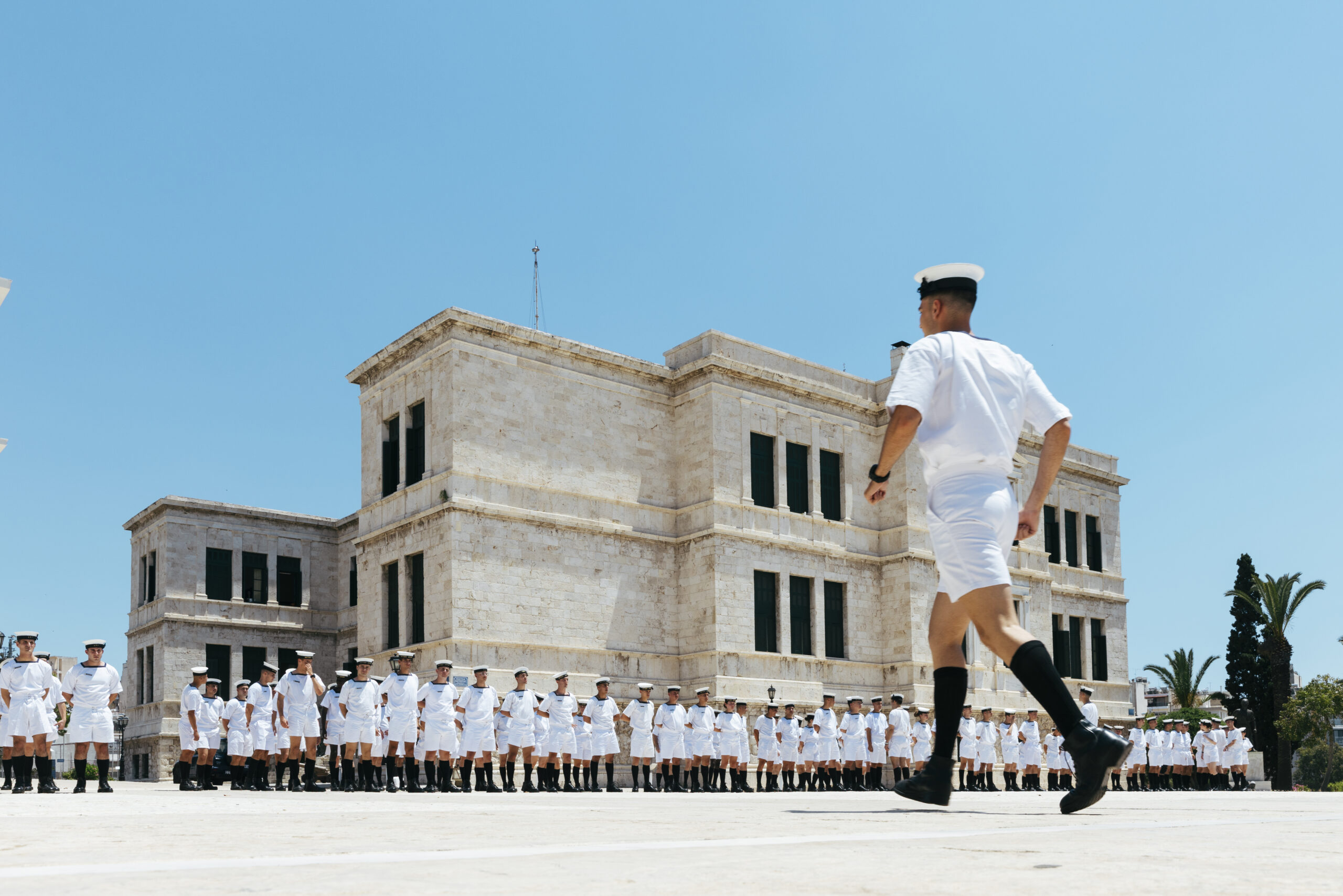 Ήταν αρχές Ιουνίου όταν βρεθήκαμε στη Σχολή Ναυτικών Δοκίμων (ΣΝΔ) στον Πειραιά με σκοπό να παρακολουθήσουμε μια μέρα στη ζωή των νέων που έχουν αποφασίσει να ακολουθήσουν καριέρα στο Πολεμικό Ναυτικό (ΠΝ). Η αρχική σιγή πέρα από τις πύλες της Σχολής λειτουργεί ελαφρώς παραπλανητικά, καθώς οι εγκαταστάσεις είναι διαρρυθμισμένες με τέτοιο τρόπο που δίνουν την ψευδαίσθηση ότι ο τόπος δεν σφύζει από ζωή. Η εντύπωση αυτή είναι λανθασμένη. Λίγο παρακάτω δύο δόκιμοι τρέχουν με κοντά σορτσάκια τους και κρύβονται πίσω από ένα κτίριο. Τους ακολουθούμε και ξαφνικά βρισκόμαστε μπροστά σε μια ομάδα από δεκάδες 19χρονους και 19χρονες πρωτοετείς που γελούν και αφήνουν να βγει προς τα έξω μια παιδιάστικη ανεμελιά μπροστά στο φακό του φωτογράφου μας Δημήτρη Βλάικου. Ήταν το διάλειμμά τους. Ένα περιορισμένο παράθυρο ανάμεσα στο τρέξιμο, τα μαθήματα, την αθλητική δραστηριότητα και τις υπόλοιπες υποχρεώσεις της ημέρας που ακολουθούν όλες ένα χρονοδιάγραμμα το οποίο τηρείται ευλαβικά.