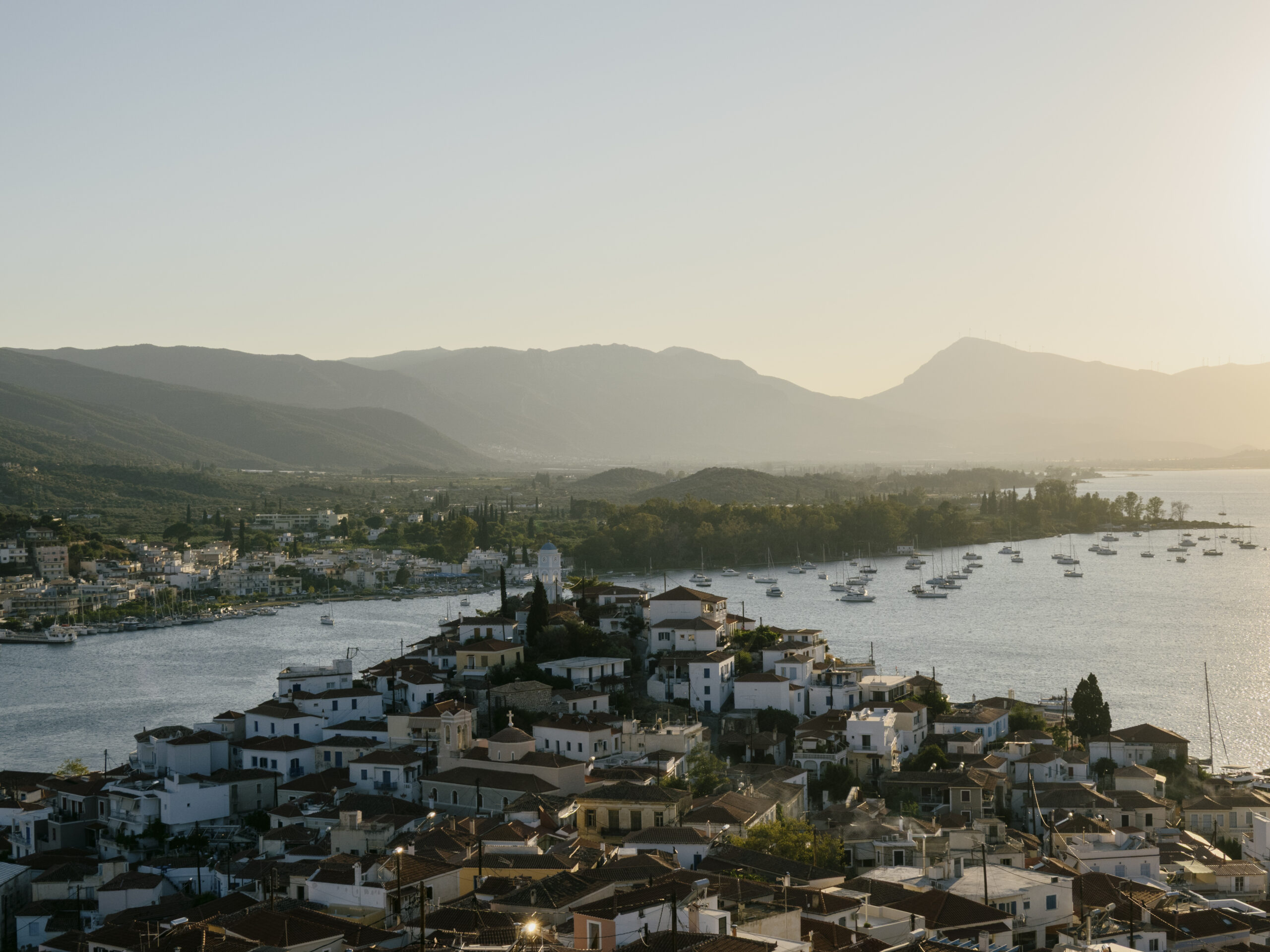 Δύο μικρά καΐκια κολλητά το ένα στο άλλο. Δύο άντρες κάνουν κουπί. Ο ένας φαίνεται να μισογελάει με τη φαιδρότητα της κατάστασης. Ο άλλος πιο συγκεντρωμένος: να γίνει η δουλειά και να περάσουν απέναντι, στον Γαλατά, που φαίνεται καθαρά στο βάθος. Και στα δύο καΐκια ταυτόχρονα ακουμπάει μια αυτοσχέδια πλατφόρμα, μερικά μαδέρια ουσιαστικά, και από πάνω ένα καμπυλωτό Renault 4CV, το μοναδικό, τότε, αυτοκίνητο του νησιού. «Αυτό ήταν το πρώτο φέρι μποτ του Πόρου», εξηγεί η Ντίνα Δάγκλη γελώντας και δείχνοντας τη φωτογραφία του ’50 που κρέμεται πίσω από τον πάγκο του οικογενειακού ζαχαροπλαστείου, πάνω από τους δίσκους με τα χιονισμένα αμυγδαλωτά και τα καρυδάτα. «Είναι δύο βάρκες ενωμένες και πάνω τους το αυτοκίνητο που είχε τότε ο γιατρός του νησιού, ο Κουνέλης. Ανέβαζαν και τον γιατρό μέσα και πήγαινε όλο αυτό το πράγμα μαζί», λέει. Η καλή θέση του τοσοδούλη Πόρου έχει διαμορφώσει τον χαρακτήρα του νησιού. «Πάμε τσάκα τσάκα να φτάσουμε απέναντι», είναι σαν να ακούς τους βαρκάρηδες της σουρεαλιστικής φωτογραφίας. Το ίδιο πρόχειρα, χωρίς ιδιαίτερο σχεδιασμό, αλλά με την εγγύτητα του νησιού να λειτουργεί πάντα ενθαρρυντικά, οι παραθεριστές συνεχίζουν να περνούν και εκείνοι στο, λιγότερο διαφημισμένο, νησί του Σαρωνικού για να πάρουν μια γεύση από ανέμελο καλοκαίρι. Είναι προσβάσιμο οδικώς (συν μόλις πέντε λεπτά με το φέρι μποτ) από τον Γαλατά. Αλλιώς, το ταχύπλοο κάνει περίπου μία ώρα από τον Πειραιά και το αργό δυόμισι ώρες και κάτι, αφήνοντάς σε να χαζέψεις τους γλάρους, την Αίγινα και τα Μέθανα στην πορεία.