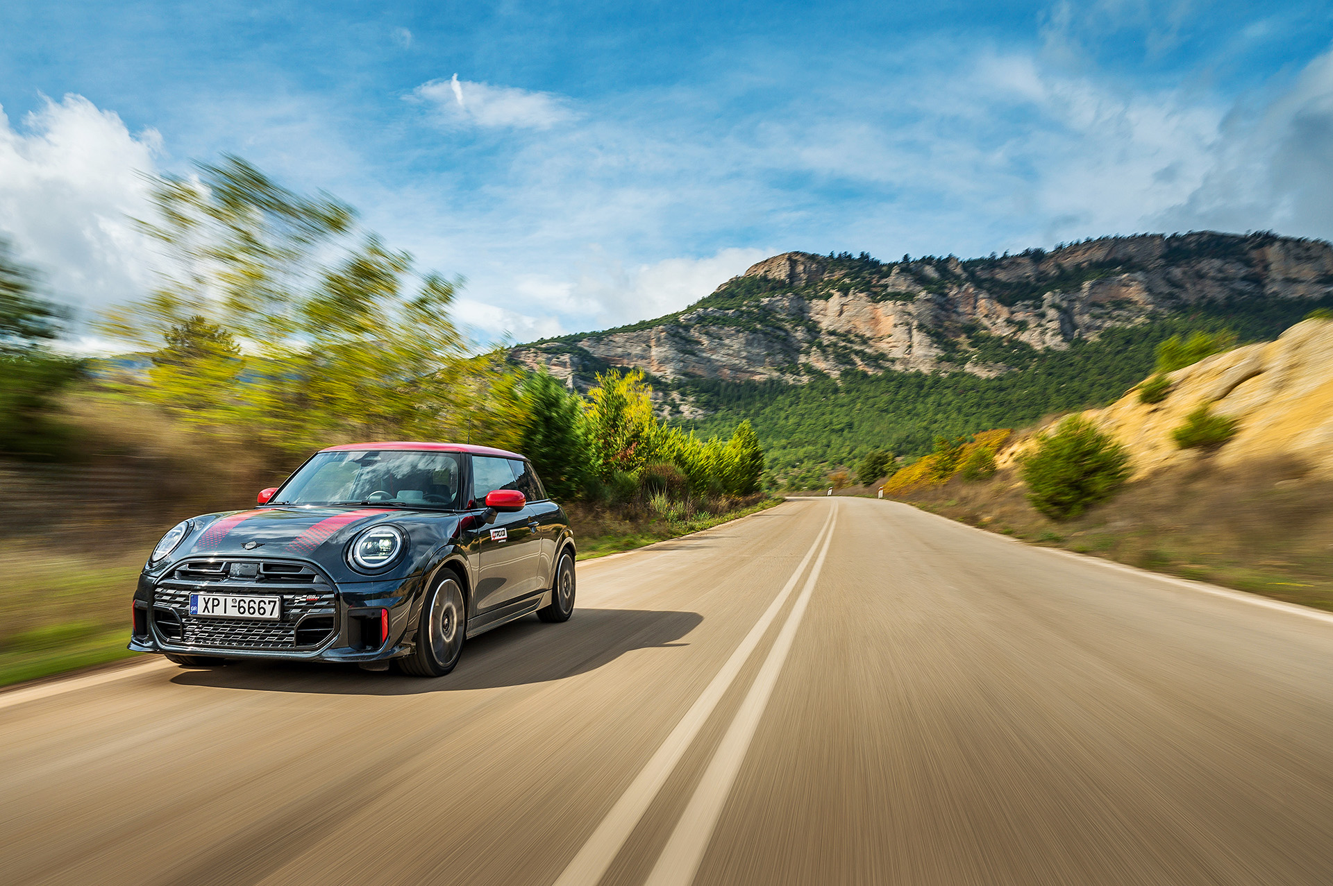 Στο δρόμο, το μεικτό ελληνικό τερέν αποκαλύπτει τον χαρακτήρα του. Κινείσαι με ένα πραγματικό πυραυλάκι σε διαστάσεις μίνι, με έναν κινητήρα παλαιάς κοπής που διαθέτει ψυχή και συνδυάζεται με σύγχρονο κιβώτιο. Η θέση οδήγησης είναι απλά τέλεια, τα φρένα αξίζουν Όσκαρ στην κατηγορία επιβράδυνσης, ενώ ο ιδιαίτερα γραμμικός κινητήρας κρύβει τη δύναμή του, αποκαλύπτοντας όμως μια εξαιρετική καμπύλη απόδοσης. Η συνεργασία του με το 7άρι κιβώτιο είναι υποδειγματική, με τα δάχτυλα συνεχώς στα paddles (αποκλειστικό προνόμιο της έκδοσης JCW), είτε ανεβάζεις είτε κατεβάζεις. Προκύπτει ακόμη και μουσικότητα, αφού ο ήχος του κινητήρα έχει δουλευτεί ώστε να ταιριάζει στη φιλοσοφία της κατασκευής.