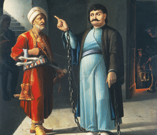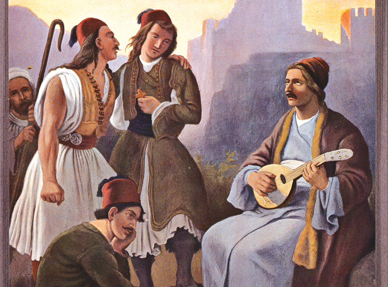 «Ο Ρήγας ψάλλει τον Θούριο», του Peter von Hess. Αντίγραφο μιας από τις σκηνές της Ελληνικής Επανάστασης του Hess, με τις οποίες ο Λουδοβίκος Α΄ της Βαυαρίας διακόσμησε τα ανάκτορα του Μονάχου (Εθνικό Ιστορικό Μουσείο, Αθήνα).