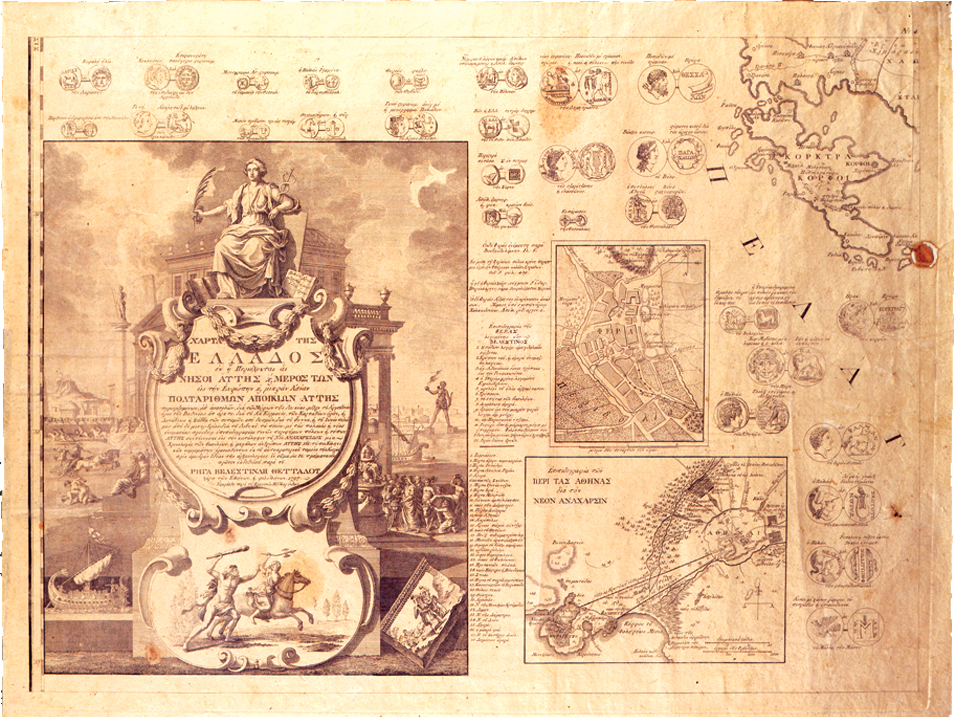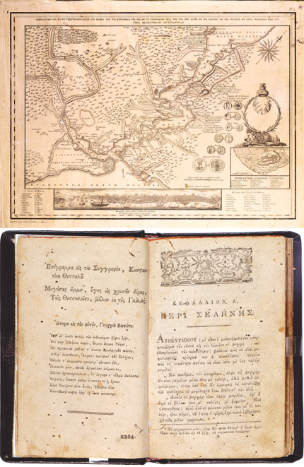 Επάνω: Το φύλλο της Χάρτας της Ελλάδος με την «Επιπεδογραφία της Κωνσταντι- νουπόλεως, του Κόλπου της, του Κατάστενού της […] και του Σαραγιού […], παρά του Ρήγα Βελεστινλή του Θετταλού, 1796. Εχαράχθη παρά του Φρανσουά Μήλλερ εν Βιέννη» (Εθνικό Ιστορικό Μουσείο, Αθήνα). Κάτω: «Περί Σελήνης»: Το πρώτο κεφάλαιο του βιβλίου Φυσικής Απάνθισμα.