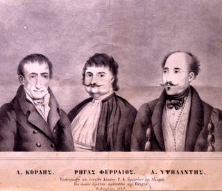 • Ο Ρήγας Βελεστινλής, πλαισιωμένος συμβολικά από τον Αδαμάντιο Κοραή και τον Αλέξανδρο Υψηλάντη, λαϊκή λιθογραφία (Εθνικό Ιστορικό Μουσείο, Αθήνα).