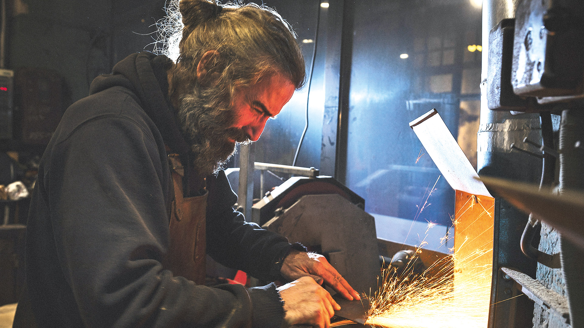 Συναντηθήκαμε στο μικρό εργαστήριο της οδού Ζάππα, στο κέντρο των Ιωαννίνων, απέναντι από το κατάστημα «Τέλης», το οποίο έχει επίσης αναμορφωθεί και εκσυγχρονιστεί. «Εδώ κάνω μικροδουλειές, τροχίσματα, κολλήματα, επιδιορθώσεις. Το κανονικό εργαστήριο είναι έξω από την πόλη», μας εξηγεί. Είναι Σάββατο βράδυ, παρ’ όλα αυτά έχει αρκετές ώρες δουλειάς ακόμα, που όπως λέει θα συνεχιστεί και την επομένη. «Το μέταλλο που χρησιμοποιώ είναι παλιός χάλυβας που βρήκαμε σε απόθεμα στην αποθήκη. Είναι δύσκολο υλικό και δεν επιδέχεται λάθη. Αν δεν το κόψεις ίσια στην αρχή, μόλις μπει στον τροχό θα στραβώσει και θα πάει χαμένη όλη η προηγούμενη δουλειά. Πολλοί προσπαθούν να το διορθώσουν ή να το κρύψουν, εγώ το πετάω γιατί στην πραγματικότητα δεν θα είναι ποτέ άρτιο», λέει.