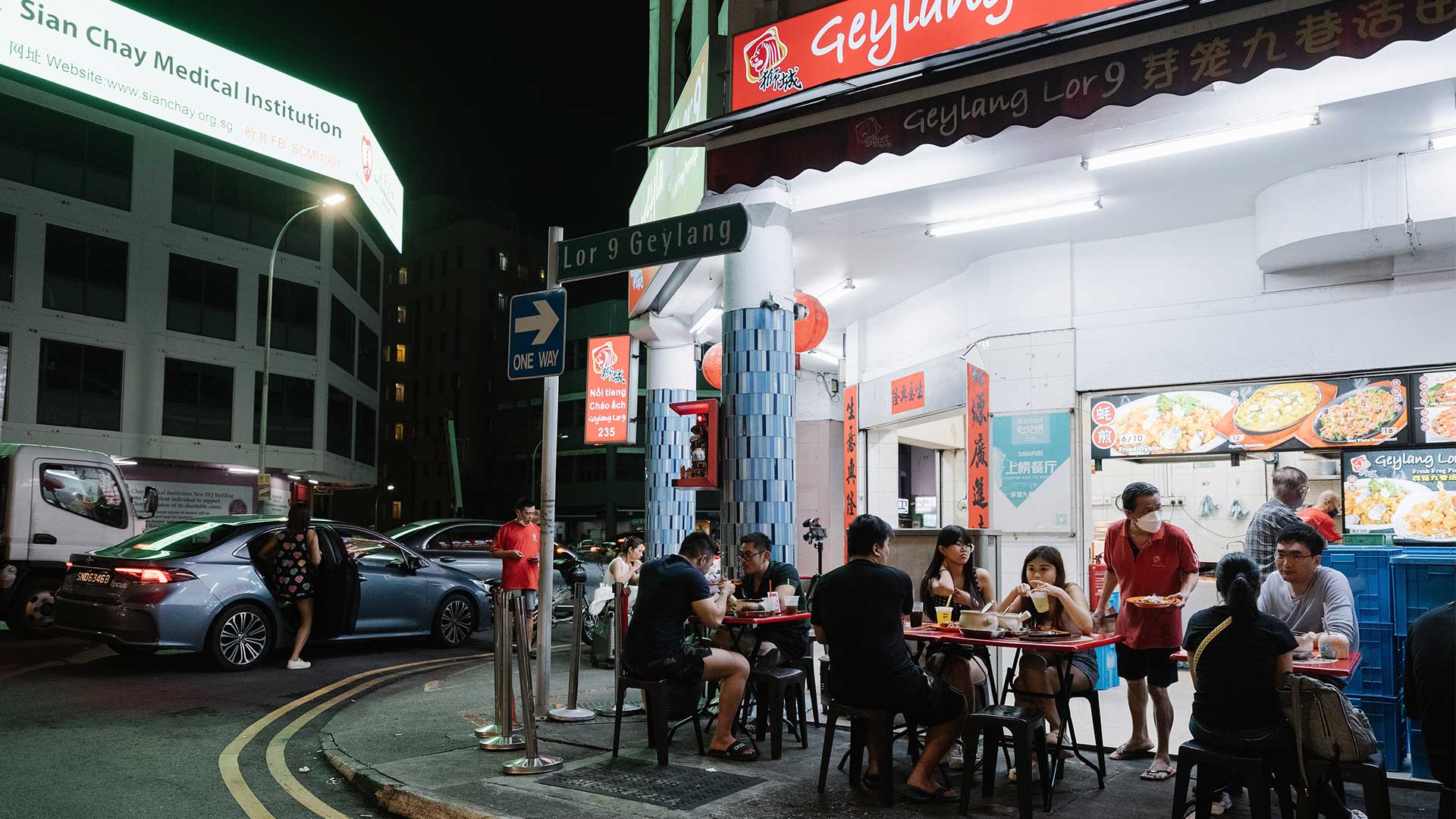 Η οδός Geylang στο κέντρο της Σιγκαπούρης είναι συνώνυμη της νύχτας, όταν αμέτρητες επιγραφές νέον ανάβουν προκαλώντας ζάλη και μεγάλες παρέες κάθονται γύρω από τραπέζια που στήνονται στα πεζοδρόμια. Είναι ένας προορισμός για βραδινές βόλτες και για να ανακαλύψετε τοπικές σπεσιαλιτέ, όπως καβούρι περιχυμένο με σάλτσα λευκού πιπεριού και αχνιστό χυλό με μαριναρισμένα βατραχοπόδαρα.