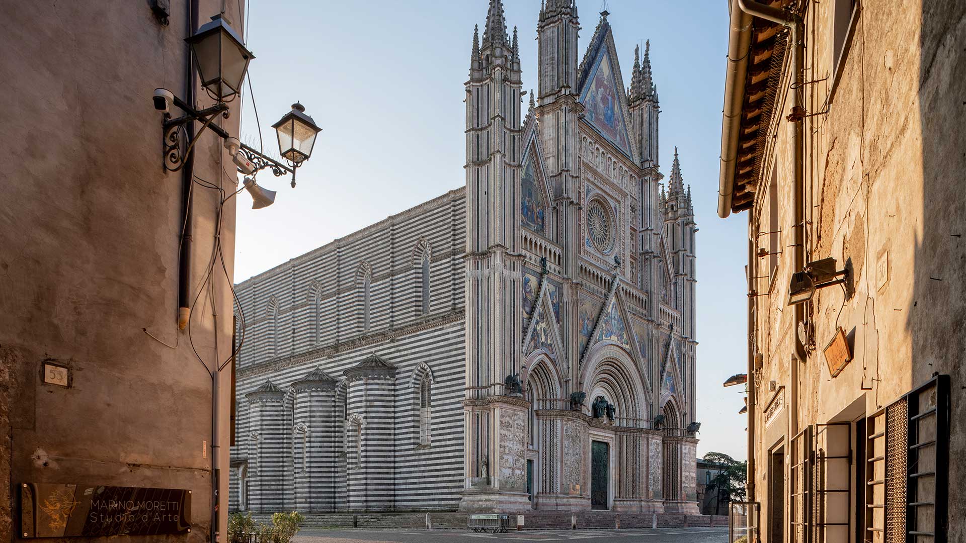 Η Ούμπρια είναι λοφώδης περιοχή, και θα χρειαστεί… ανάβαση για να φτάσετε από τον σιδηροδρομικό σταθμό κάθε πόλης στο κέντρο της. Κάθε πόλη, επίσης, έχει τον τρόπο της για να σας διευκολύνει. Στο Ορβιέτο θα πάρετε το τελεφερίκ (εισιτήριο 1,30 ευρώ). H πόλη είναι κτισμένη πάνω σε ένα βραχώδες ύψωμα και από μακριά μοιάζει με καρτ ποστάλ, ενώ εξίσου εντυπωσιακή είναι η θέα που προσφέρει τόσο στην καταπράσινη κοιλάδα που απλώνεται στα «πόδια» της όσο και στους λόφους που ορθώνονται στον ορίζοντα. Στο υψηλότερο σημείο της πόλης, δεσπόζουν οι πύργοι του τεράστιου Καθεδρικού Ναού της Κοιμήσεως της Θεοτόκου, που άρχισε να κατασκευάζεται το 1290 σε ανάμνηση ενός θαύματος που είχε συμβεί το 1263 στην γειτονική Μπολσένα, κατά την διάρκεια της Θείας Κοινωνίας, όταν αίμα κύλησε από τον άρτο που συμβολίζει το σώμα του Χριστού και λέκιασε το ύφασμα της Θείας Μεταλήψεως, το οποίο φυλάσσεται μέχρι σήμερα.