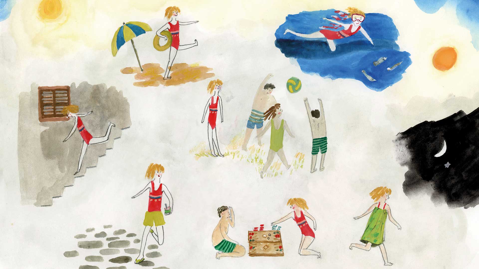 Όταν ήμουν παιδί στην Κάλυμνο, δεν υπήρχε μέρα που να μην πήγαινα να δω τη γιαγιά Ειρήνη. Μικροσκοπική, μαυροντυμένη, αλλά πάντα γελαστή, μας έδινε τα σύκα της ημέρας από τον κήπο της. Θυμάμαι ακόμα τη μεσημεριανή σιέστα, να μαθαίνω να κολυμπάω, να παίζω με τα κύματα, να βουτάω με τη μάσκα και να χαζεύω με τις ώρες τα μικρά ψαράκια, χάνοντας την αίσθηση του χρόνου. Να ανεβαίνω και να κατεβαίνω από το δωμάτιο στην παραλία 50 φορές και από την παραλία στην ταβέρνα άλλες τόσες. Να παίζω ντροπαλά με τα παιδιά της περιοχής. Να μαζεύω κοχύλια, ο μπαμπάς μου να κάνει τον κροκόδειλο στην άκρη της θάλασσας κι εμείς να ξεκαρδιζόμαστε. Να κολλάω στον λαιμό του και να με τραβάει μακριά. Να τον βλέπω να κολυμπάει και να τον μιμούμαι, να πίνω νερό και να ξαναρχίζω. Να με τσιμπάνε κουνούπια, σφήκες, να πατάω αχινό. Να παίρνω έναν υπνάκο κάτω από ένα αλμυρίκι ή στο πίσω κάθισμα του αυτοκινήτου ή στις καρέκλες της ταβέρνας. Να τρώω χταποδάκι ψητό αντί για γλειφιτζούρι, καλαμάρι τηγανητό πρωί και μεσημέρι, ρύζι με κιμά, ελιές –πολλές ελιές–, καρπούζι, σύκα, σταφύλια, λουκουμάδες με πολύ μέλι και ξηρούς καρπούς, μπακλαβά, σουβλάκια, πατατούλες, ντολμαδάκια, παξιμάδια, παγωτό από το περίπτερο – αυτό με το δώρο κρυμμένο κάτω από το κυπελλάκι. Να μαθαίνω να παίζω τάβλι και βελάκια, να κάνω φόρεμα το παρεό μου, να ακούω τους ενήλικες να μιλάνε, να γελούν, να πίνουν και να τρώνε αργά, τόσο αργά…