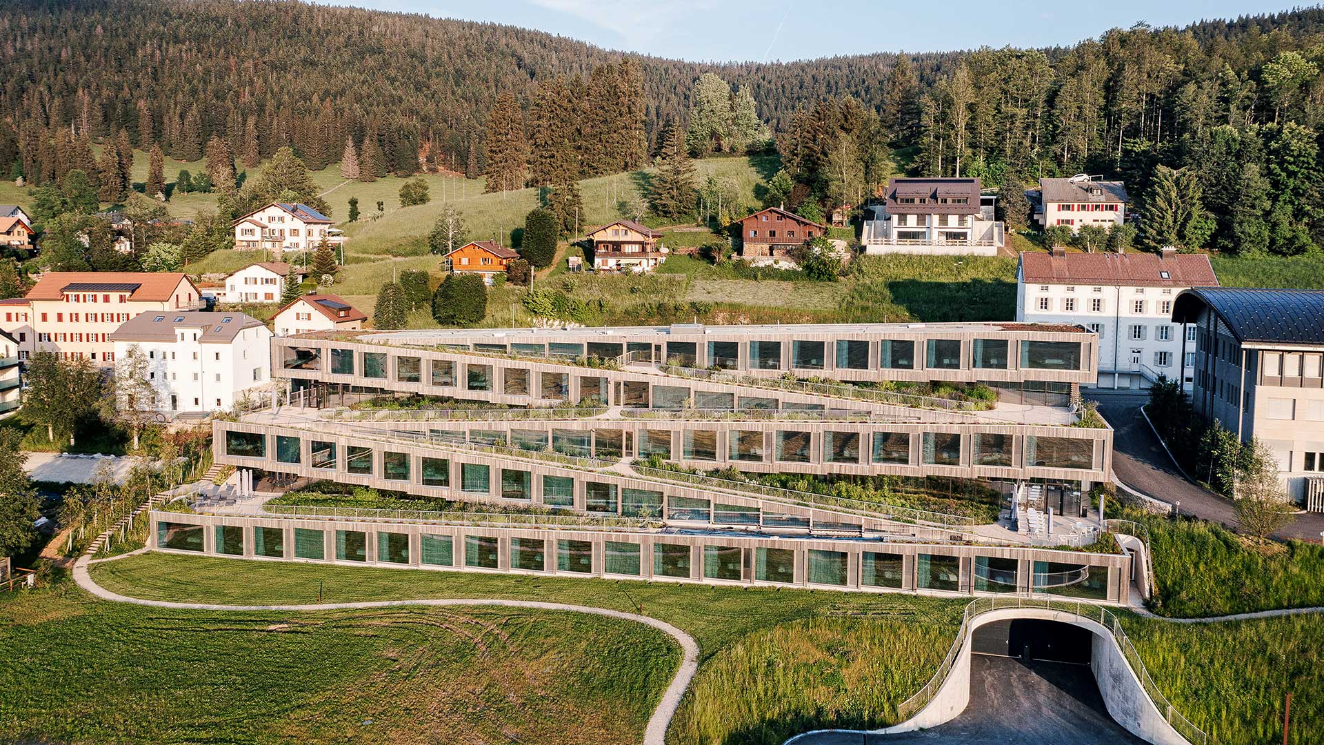 Τρεις πόρτες πιο κάτω από το ελικοειδές μουσείο, άλλο ένα κτίριο άνοιξε τον Ιούνιο του 2022: είναι το Hôtel des Horlogers, ένα ξενοδοχείο που επίσης φέρει την αρχιτεκτονική σφραγίδα του Bjarke Ingels Group. Ενώ το μουσείο είναι γεμάτο καμπύλες, το ξενοδοχείο είναι γεμάτο γωνίες. Αναπτύσσεται σε μορφή ζιγκ ζαγκ, ξεκινώντας από το επίπεδο του δρόμου και κατεβαίνοντας την ίδια καταπράσινη πλαγιά, με το γκρι σκυρόδεμα να προεξέχει σε κάθε πλευρά ακατέργαστο, όπως μια κορυφογραμμή. Κάθε στροφή του είναι και ένας νέος όροφος και από τα παράθυρα, που εκτείνονται από το δάπεδο έως την οροφή, προσφέρει σε καθένα από τα 50 δωμάτια του ξενοδοχείου ανεμπόδιστη θέα στο λιβάδι με τις αγελάδες που βόσκουν αμέριμνα και στο δάσος Risoud στο βάθος. Το ξενοδοχείο ανήκει και αυτό στην Audemars Piguet.