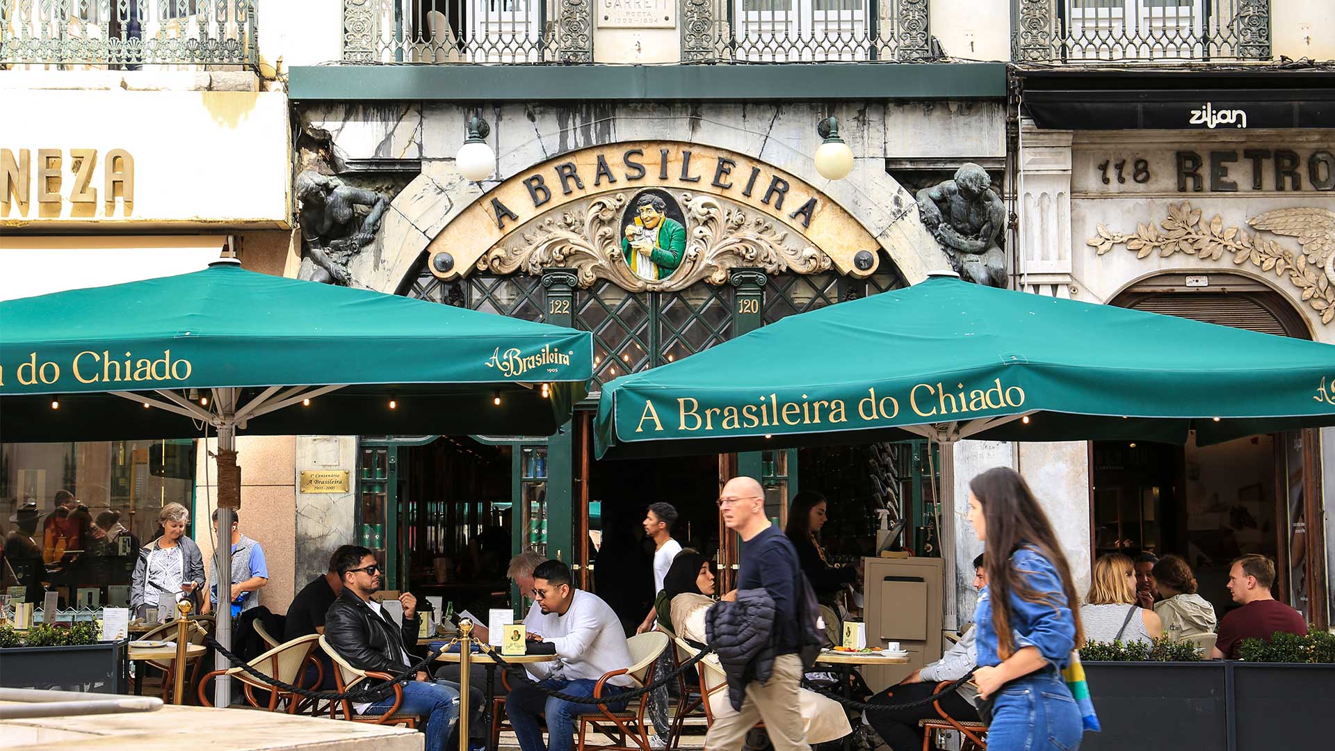 Σχεδόν απέναντι από το Bertrand, στην μικρή πλατεία Largo do Chiado, βρίσκεται το πιο διάσημο café της πόλης, σκηνικό καλλιτεχνικών και πολιτικών αναζητήσεων του περασμένου αιώνα και αγαπημένο στέκι του Fernando Pessoa, μεταξύ άλλων. Από τη δεκαετία του ’80, όταν έγιναν τα αποκαλυπτήρια του χάλκινου αγάλματός του από τον γλύπτη Lagoa Henriques, ο ποιητής συνεχίζει να κάθεται στην αγαπημένη του θέση έξω από το art deco «διαμάντι» της Λισαβόνας, που έχει διατηρήσει το αριστοκρατικό του στυλ για περισσότερο από έναν αιώνα. Σχεδιασμένο από τον βραβευμένο αρχιτέκτονα Manuel Norte Júnior, το Α Brasileira συνεχίζει να εισάγει καφέ από τη Βραζιλία και να ακολουθεί την ιεροτελεστία της bica, όπως την είχε φαντασιωθεί ο ιδρυτής του Adriano Telles το 1905. Αν και από τις πλέον τουριστικές στάσεις της πόλης, η εμπειρία του καφέ στη «Βραζιλιάνα» είναι πολύ ιδιαίτερη. Δοκιμάστε το galão -καφέ με γάλα- μαζί με το παραδοσιακό γλυκό pastel de nata. Κι αν σας ανοίξει η όρεξη, τολμήστε τη σπεσιαλιτέ του καταστήματος, αγαπημένη του Pessoa: μπριζόλα με τσιπς και αυγό τηγανητό.