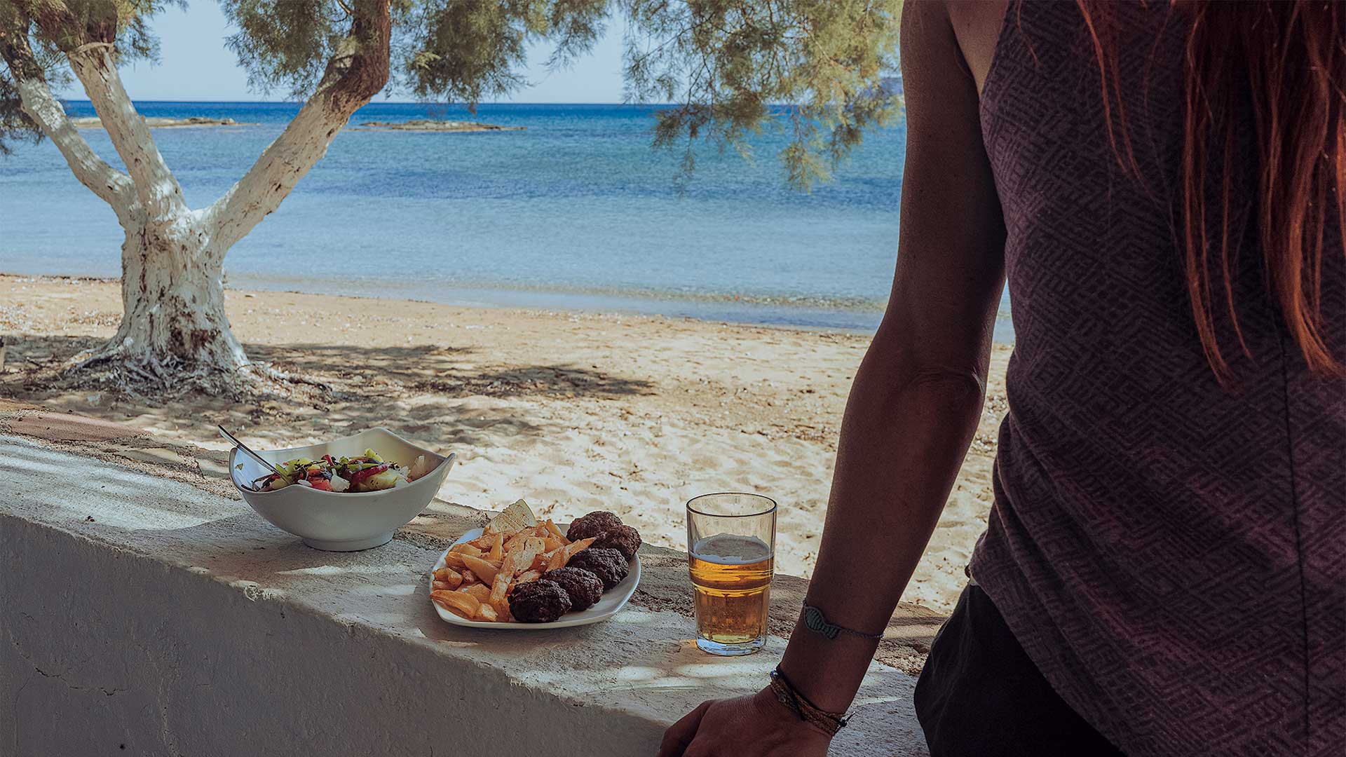 Μια αγγουροντομάτα με τη ρίγανη, μια χωριάτικη με κρίταμο κι ελιές, φάβα με ωμό ξερό κρεμμύδι, βλίτα, χταποδάκι βραστό, καλαμάρια και γαριδάκια τηγανητά, πατάτες χρυσοτηγανισμένες, μπάμιες, κολοκυθάκια τηγανητά, τραπεζάκια στην άμμο κι αρμυρίκια που λικνίζονται. Ωδή στην απλότητα είναι αυτή η ψαροταβέρνα που ο χρόνος δεν την αγγίζει. Οι ιδιοκτήτες αξιοποιούν τη δική τους ψαριά, συνήθως μικρόψαρα, από το καΐκι απευθείας στο τηγάνι, σερβίρουν ντόπια ζαρζαβατικά και τυριά. Η λογική του zero-km βασιλεύει, κι αυτό συνέβη εδώ πριν καν εφευρεθεί ο όρος. Ευγενική εξυπηρέτηση, «ευγενικές» και οι τιμές.