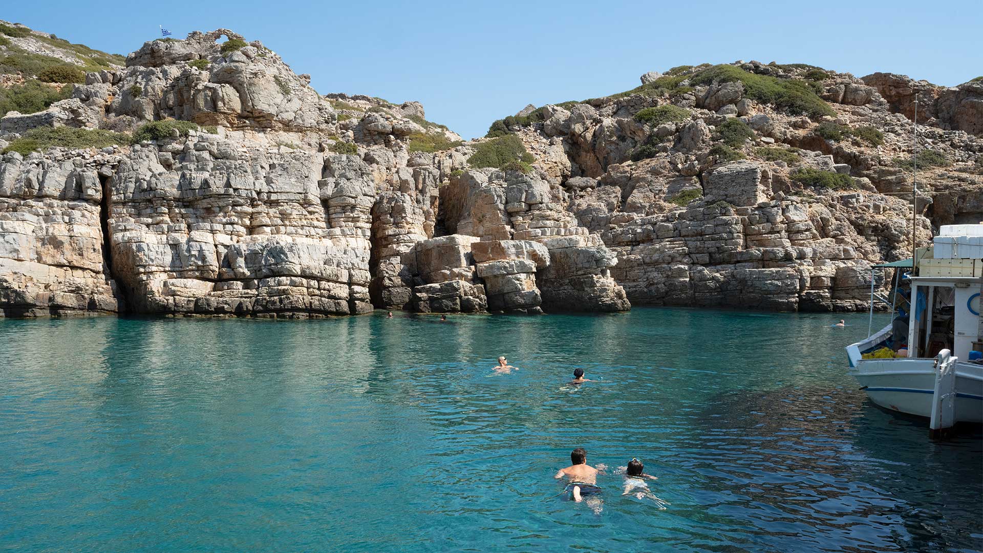 Κατά μήκος του κόλπου της Σαρίας κολυμπήσαμε μέσα στα μοναδικά θαλάσσια σπήλαια. Σε ένα, μάλιστα, οι ακτίνες του ήλιου φώτιζαν το εσωτερικό ακριβώς την ώρα που εμφανίστηκε ένα σμήνος ψαριών, -πιθανώς σκάροι-, ενώ σ’ ένα άλλο βγήκαμε με μακροβούτι ξανά στον μεγαλειώδη κόλπο – απίστευτη εμπειρία! Στην παραλία μας περίμενε ένα πεντανόστιμο μπάρμπεκιου με κρεατικά αλλά και ψάρια, ό,τι ήθελε ο καθένας, και σαλάτες που ετοίμασε ο καπετάν Νίκος. Τα απολαύσαμε κάτω από τα αρμυρίκια, παρέα με τα αγριοκάτσικα που καραδοκούσαν! Πάνω στο καΐκι, το απόγευμα, ο καπετάνιος μας φύλαγε καινούργιες εκπλήξεις, αφού περάσαμε μέσα από πανύψηλα βράχια, σαν φιόρδ με σμαραγδένια νερά, και βρεθήκαμε σ’ ένα βαθύ απάνεμο κόλπο με μια λευκή εξωτική παραλία με το όνομα Αλιμούντα, για ένα ακόμα αξέχαστο μπάνιο.