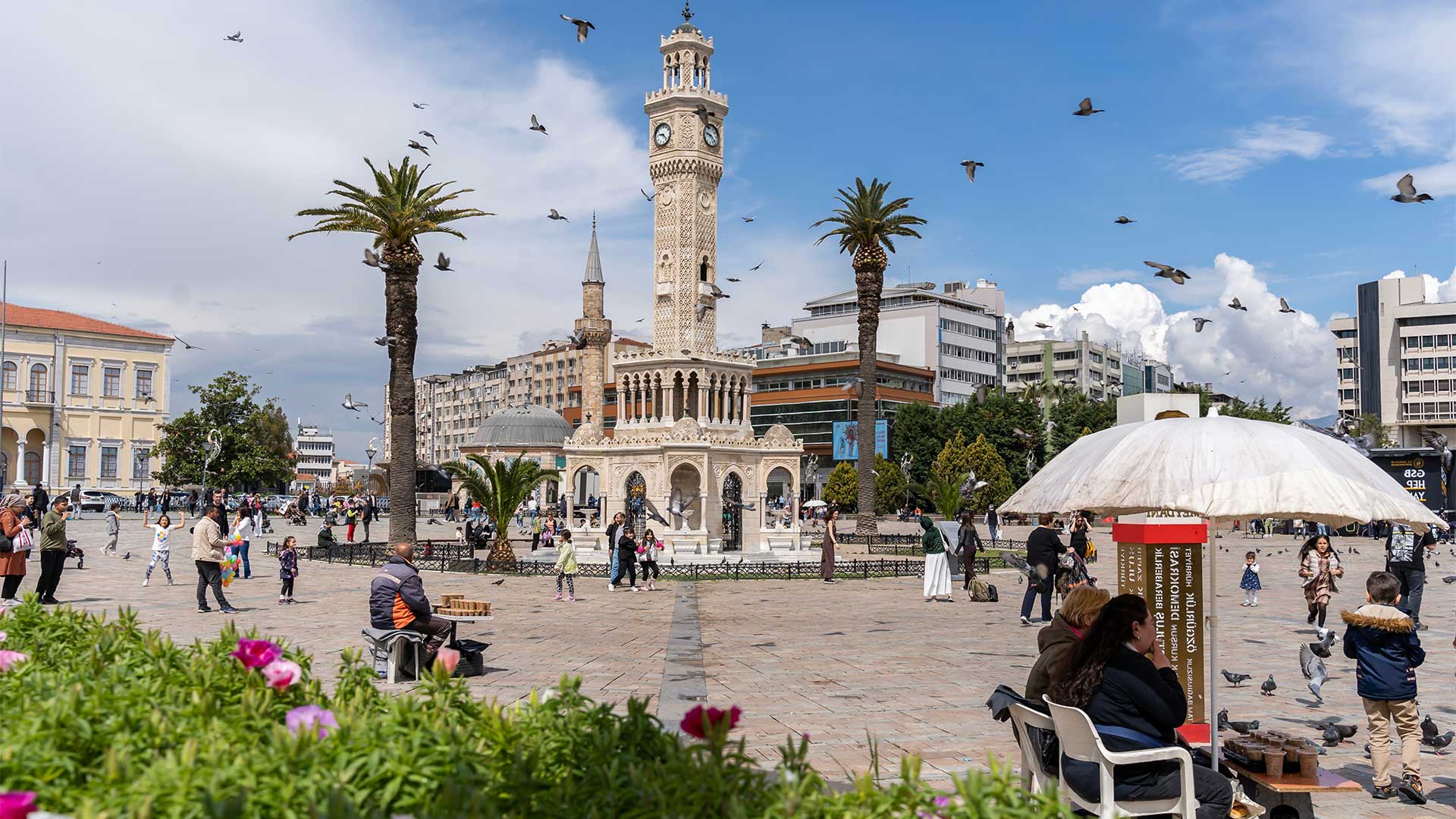 Στο κέντρο της πλατείας Konak, παρέα με το Yali Camii, ένα από τα πιο όμορφα τζαμιά της πόλης, αλλά και το ιστορικό κτίριο ιωνικής αρχιτεκτονικής που πλέον αποτελεί την έδρα του Κυβερνητικού Μεγάρου, βρίσκεται ένας πύργος οθωμανικού στυλ του 1901, γνωστός ως Saat Kulesi. Στην πραγματικότητα ο Πύργος του Ρολογιού, που χτίστηκε από τον Γάλλο αρχιτέκτονα Père, αποτελείται από τέσσερα ρολόγια στην κορυφή του, δώρο του Γερμανού Αυτοκράτορα Γουλιέλμου Β’, και τέσσερα σιντριβάνια στη βάση του. Θεωρείται το Σύμβολο της Σμύρνης και είναι ένα από τα πιο φωτογραφημένα αξιοθέατά της.