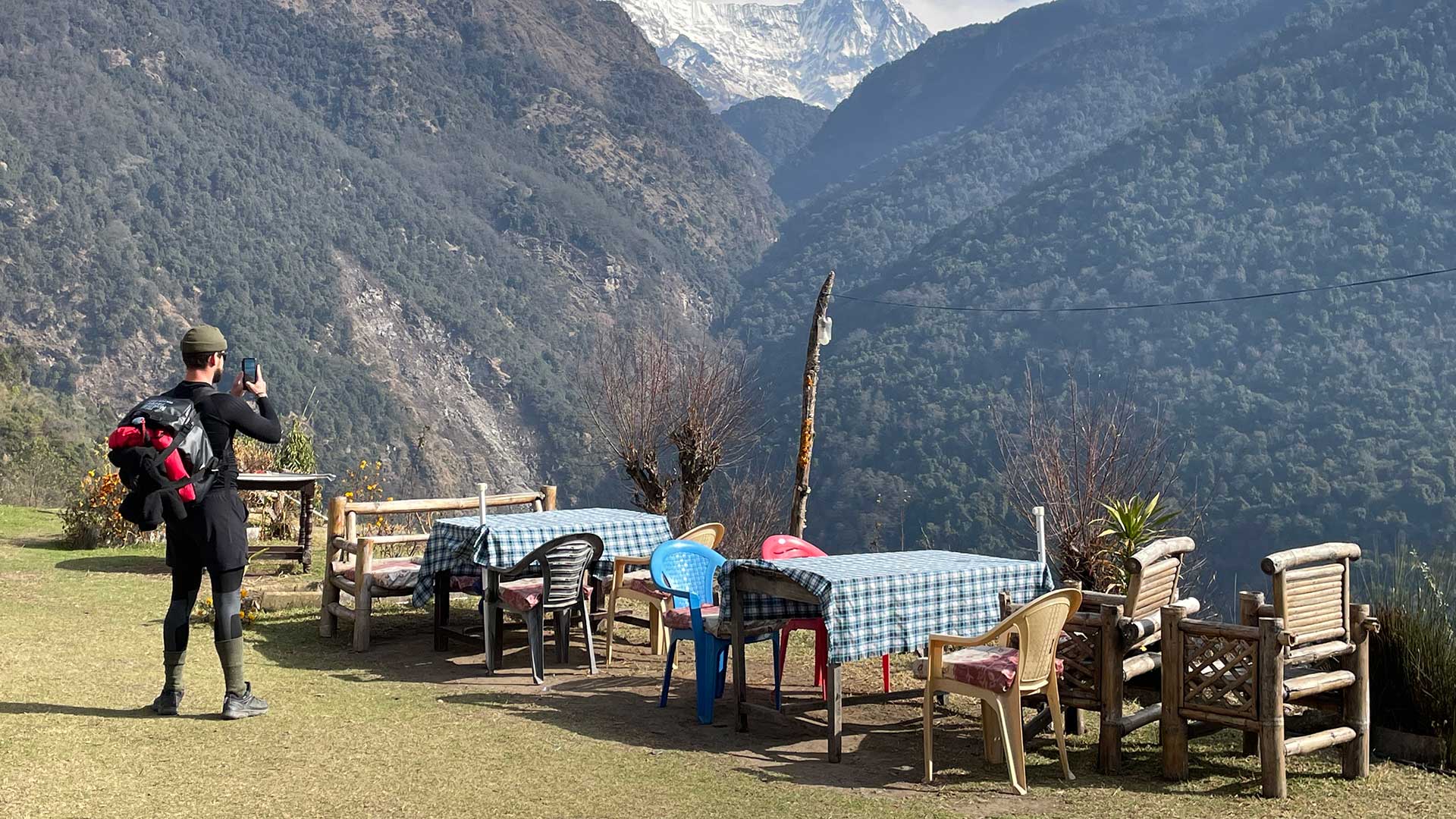 Το δωμάτιο που βρήκαμε για διανυκτέρευση προσέφερε καταπληκτική θέα στις χιονισμένες κορφές και είχε ζεστό νερό αλλά όχι θέρμανση. Κατεβήκαμε στην μικρή αίθουσα φαγητού με την ξυλόσομπα και φάγαμε takhali (παραδοσιακό πιάτο του Νεπάλ με κύριο συστατικό τις φακές και το ρύζι). Συνοδεύσαμε το γεύμα μας με το τοπικό ποτό raksi (ο Ιάσoνας με τη νεπαλέζικη μπίρα Ghurka), έχοντας για παρέα δυο Γαλλίδες ινδικής και κινεζικής καταγωγής και τον οδηγό τους.
