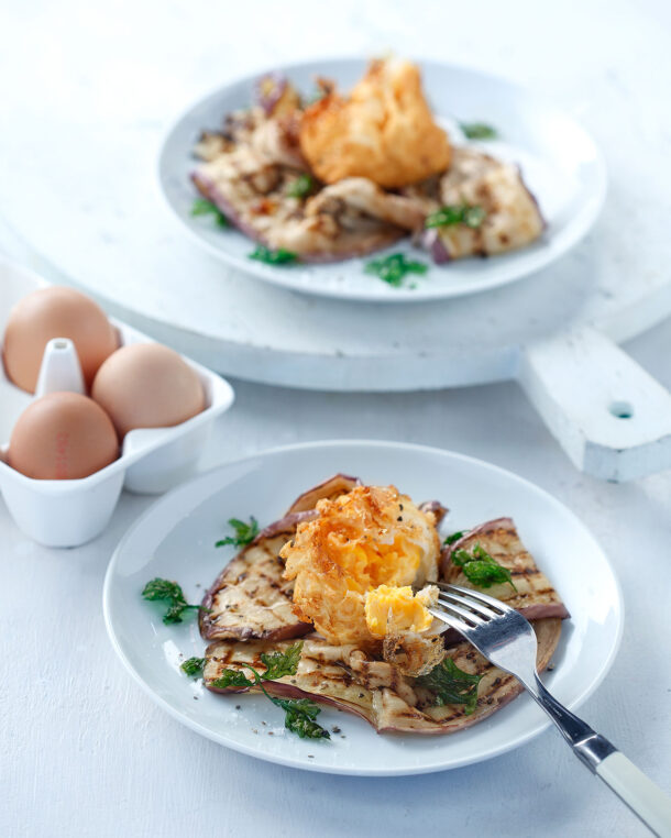 Φτιάχνουμε τραγανές φωλιές αυγού και τις σερβίρουμε με σοταρισμένες μελιτζάνες. Τέλεια ιδέα αυτό το πιάτο που ετοιμάζεται στο πι και φι
