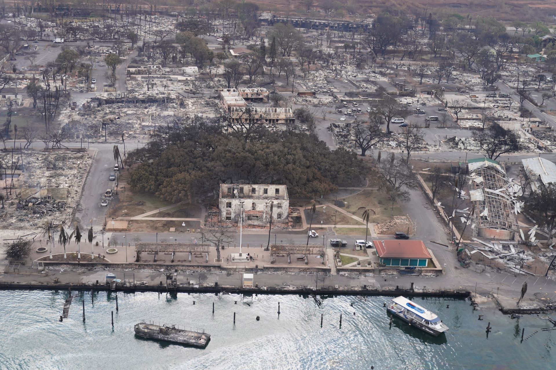 Το δέντρο που οι ντόπιοι αποκαλούν «παλμό της Λαχάινα», αν και με καμένα κλαριά χωρίς ίχνος πράσινου πάνω τους, εξακολουθούσε να στέκει «λαβωμένο» στη θέση του.