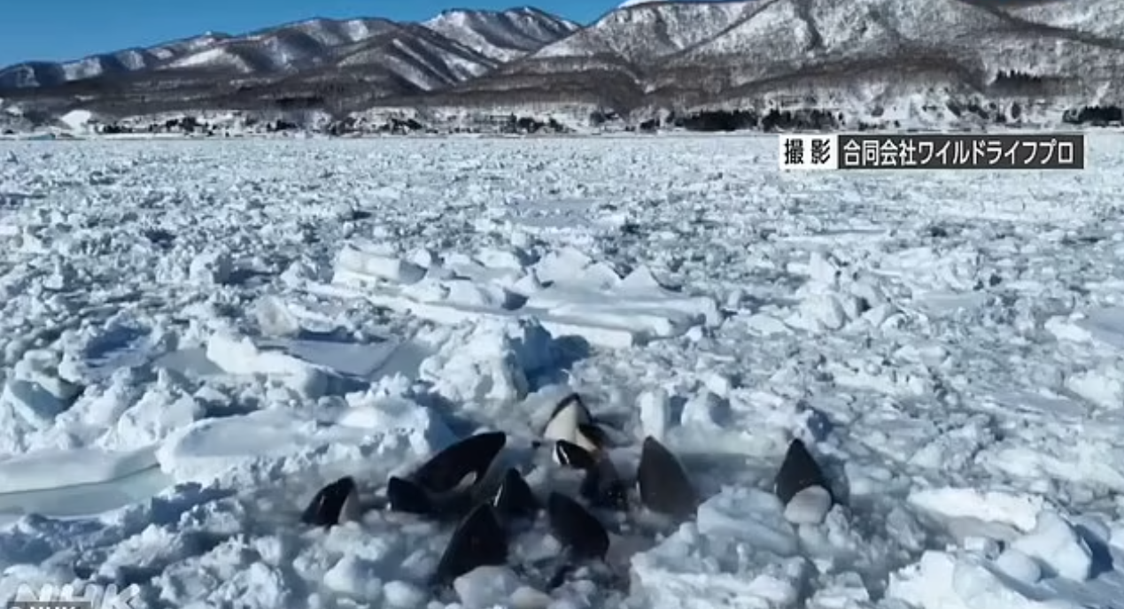 Εικόνες από αέρος που μετέδωσε το κρατικό δίκτυο ΝΗΚ καταγράφουν τουλάχιστον δέκα φάλαινες-δολοφόνους «στριμωγμένες» σε ένα άνοιγμα μεταξύ πυκνών τμημάτων πάγου, περίπου ένα χιλιόμετρο από τις ακτές του Ραούσου στην χερσόνησο Σιρετόκο – μνημείο παγκόσμιας κληρονομιάς της Unesco που φημίζεται για τον πλούτο άγριας ζωής.