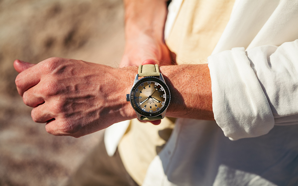 Ασορτί με την απόχρωση του καντράν είναι και το λουράκι του, από ναυτικό καμβά στο χρώμα της άμμου.