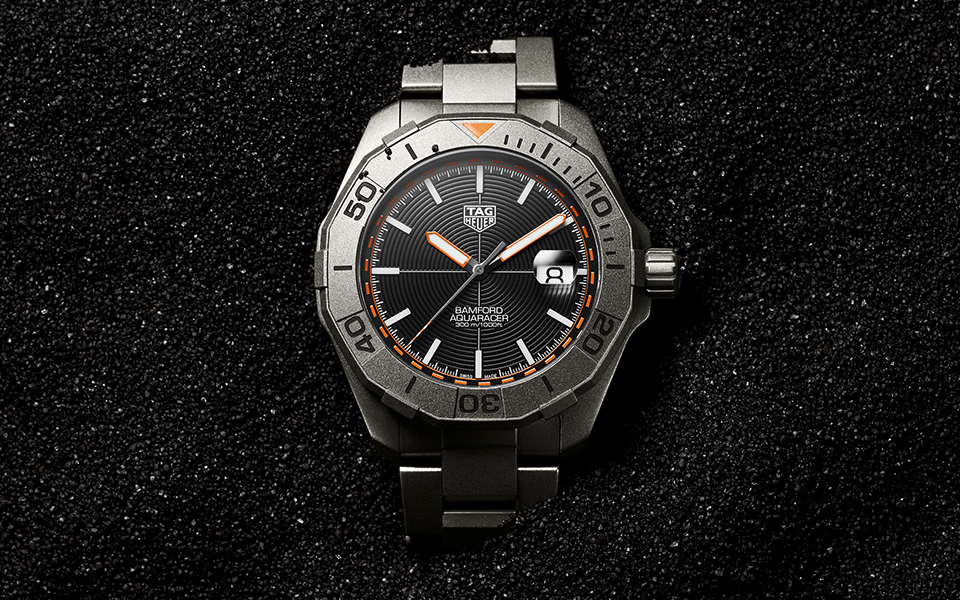 Το νέο TAG Heuer Aquaracer Bamford Limited Edition φέρει το όνομα Bamford στη θέση 6 ενώ μικρές πορτοκαλί πινελιές δίνουν ένταση στους δείκτες, τη στεφάνη και την εσωτερική φλάντζα του κατάμαυρου καντράν.