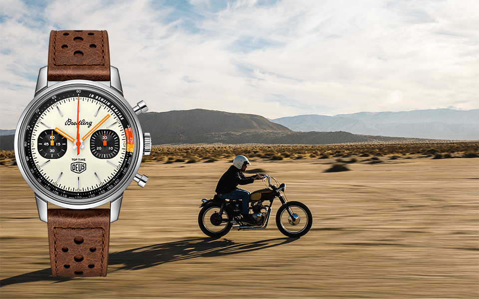 Η αγάπη της Breitling για τις μοτοσικλέτες και για τον κόσμο του σερφ είναι δεδομένη, συνεπώς η σύμπραξή της με αυτή την εταιρεία μοιάζει με φυσικό επακόλουθο. Ο νέος χρονογράφος Top Time Deus Limited Edition σχεδιάστηκε για άνδρες και γυναίκες που λατρεύουν ένα περιπετειώδη τρόπο ζωής, γεμάτο δράση και επαφή με τη φύση. Η συνεργασία των δύο εταιρειών σημαίνει ότι η Breitling αναλαμβάνει και επίσημος χρονομέτρης του Deus Swank Rally, του θρυλικού πρωταθλήματος ταχύτητας με vintage μοτοσικλέτες, το οποίο λαμβάνει χώρα σε διάφορα μέρη του κόσμου, όπως η Ιταλία, η Γαλλία, η Αυστραλία και το Μπαλί.