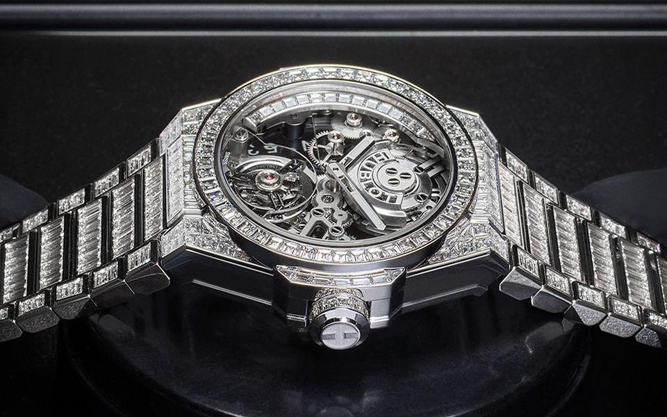 Εδώ έχουμε ακόμη δύο σπεσιαλιτέ της Hublot σε ένα ρολόι. Το νέο Big Bang Integral Tourbillon High Jewellery διαθέτει έναν αυτόματο μηχανισμό με tourbillon, εξολοκλήρου σχεδιασμένο και κατασκευασμένο in-house, και ο περίτεχνος μικρόκοσμός του είναι εκτεθειμένος σε κοινή θέα και πλαισιωμένος από 484 διαμάντια baguette συνολικού βάρους 31 καρατίων, τα οποία καλύπτουν τα πάντα: κάσα, μπρασελέ, κούμπωμα, κορώνα, στεφάνη καθώς και μέρη του skeleton καντράν. Το εντυπωσιακό είναι ότι η τιμή του δεν ξεπερνάει το ένα εκατομμύριο, όπως αλλά είναι μόλις 675.000 €! Το τελευταίο σχόλιο βεβαίως αναφέρεται στην προϊστορία της Hublot στη δημιουργία πανάκριβων μοντέλων ντυμένων εξολοκλήρου με διαμάντια. Από το πρώτο Big Bang του ενός εκατομμυρίου το 2007, ακολούθησαν και άλλα απαστράπτοντα μοντέλα αξίας δύο ή και πέντε εκατομμυρίων ευρώ.