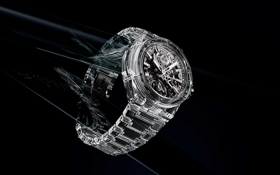 Εδώ η Hublot ξεπέρασε για άλλη μία φορά τον εαυτό της. Είναι γεγονός ότι κάποιες φορές ισχύει το less is more και ενίοτε η αφαίρεση προσφέρει πολλά περισσότερα από όσα θα περίμενε κανείς. Στην περίπτωση του Big Bang Integral Tourbillon Full Sapphire, η Hublot εφοδίασε το εντελώς διάφανο Big Bang της με επίσης διάφανο μπρασελέ φτιαγμένο και αυτό από κρύσταλλο ζαφειριού! Είναι άλλη μία παγκόσμια πρωτοτυπία, εξαιρετικά δύσκολη στην εκτέλεσή της καθώς το ζαφείρι εκτός από πολύ σκληρό είναι και εύθραυστο στην επεξεργασία του. Τα πάντα λοιπόν βγαίνουν στο φως, και βεβαίως σε πρώτο πλάνο είναι ο ειδικά σχεδιασμένος αυτόματος μηχανισμός με tourbillon, πολλά από τα μέρη του οποίου είναι και αυτά από διαφανές κρύσταλλο ζαφειριού! Πρόκειται για limited edition 30 μόλις κομματιών και η τιμή του είναι 416.000 €!