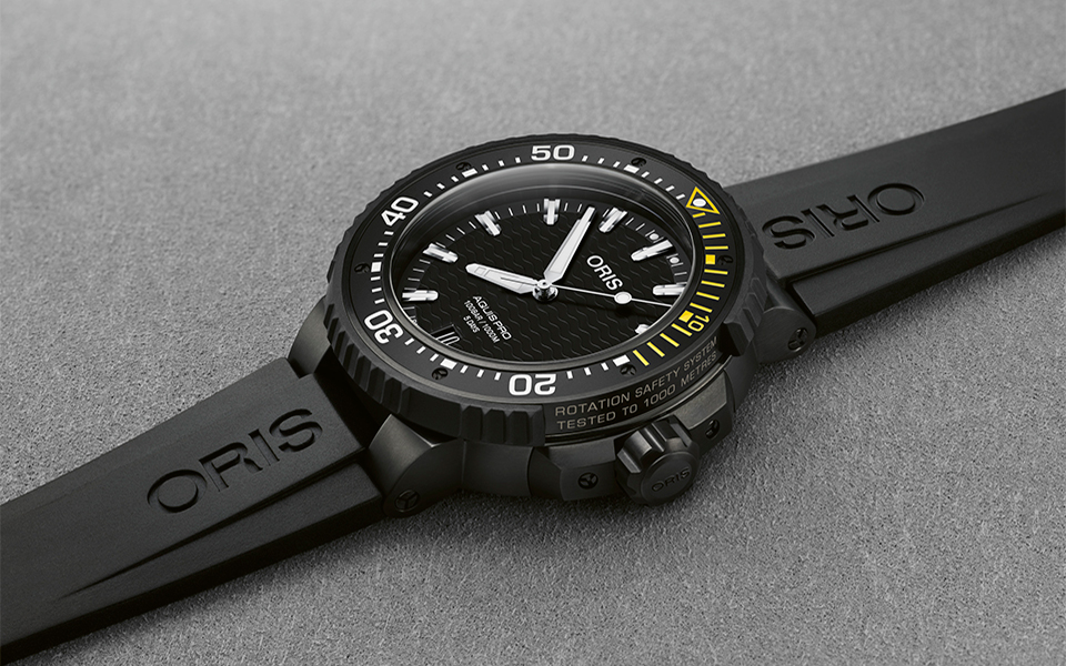 Με συμπαγή κάσα διαμέτρου 49,5mm από τιτάνιο επιστρωμένο με αντιθαμβωτικό μαύρο DLC, στεγανή μέχρι 1.000 μέτρα βάθος, αυτό το αυθεντικό εργαλείο βυθού είναι πλέον εφοδιασμένο με τον ολοκαίνουριο αυτόματο Calibre 400 της Oris, o οποίος προσφέρει πέντε ολόκληρες ημέρες αυτονομίας χάρη στα δύο βαρέλια του όπως και εξαιρετική αντοχή στα μαγνητικά πεδία. (δείτε περισσότερα για τον νέο μηχανισμό εδώ).