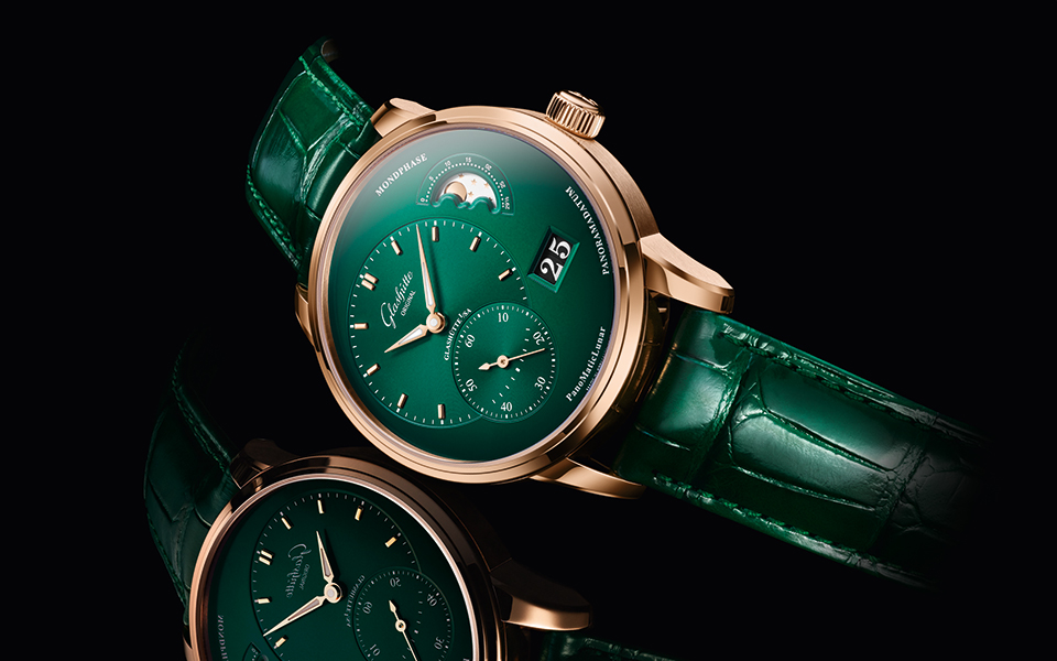 Το PanoMaticLunar της Glashütte Original κυκλοφορεί στην αγορά εδώ και τουλάχιστον δύο δεκαετίες και αποτελεί βασικό πυλώνα στη συλλογή της γερμανικής ωρολογοποιίας. Με ωραίες κλασικές γραμμές αλλά και ιδιαίτερο design που το αναγνωρίζεις αμέσως, έχει αποκτήσει το δικό του φανατικό κοινό σε όλο τον κόσμο. Και ενώ τα πρώτα μοντέλα ήταν πιο αυστηρά και λιτά σε ύφος (αναμενόμενο λόγω του γερμανικού τους ταμπεραμέντου), με ατσάλινη κάσα και ασημί, μαύρο ή μπλε καντράν, τα τελευταία χρόνια η Glashütte Original έδειξε μία προθυμία να φρεσκάρει το συγκεκριμένο μοντέλο, λανσάροντας διάφορες χρωματιστές εκδόσεις του, π.χ. ατσάλινο με καντράν από σομόν οπαλίνα, χρυσό σε συνδυασμό με μπλε καντράν και, πιο πρόσφατα, ατσάλι ή χρυσό με πράσινο καντράν.