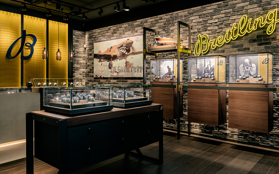 Ακριβώς απέναντι από την είσοδο, μπροστά από έναν κατακίτρινο τοίχο πάνω στο οποίο δεσπόζει το μπλε λογότυπο της Breitling, υπάρχει ένα μπαρ, στο οποίο οι επισκέπτες μπορούν να σερβιριστούν κάποιο δροσιστικό ποτό ή καφέ και ταυτόχρονα να αγγίξουν, να περιεργαστούν με την ησυχία τους και να δοκιμάσουν στον καρπό τους τα ρολόγια της ελβετικής εταιρείας.