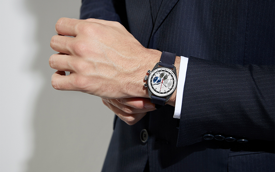Ο χρονογράφος συνδυάζεται είτε με δερμάτινο λουράκι με τριπλό αναδιπλούμενο κούμπωμα είτε με ανασχεδιασμένο ατσάλινο μπρασελέ με διπλό αναδιπλούμενο κούμπωμα.