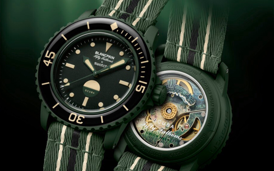 Η συλλογή Bioceramic Scuba Fifty Fathoms -για τους φίλους “Blancpain X Swatch”- πήρε την ιδέα που έκανε το Moonswatch τόσο πετυχημένο και την πήγε ένα βήμα παραπέρα: Αφ’ ενός, βασίστηκε σε ένα θρυλικό μοντέλο, το Fifty Fathoms της Blancpain, με την περιστρεφόμενη στεφάνη του και το μαύρο καντράν με τα φωσφορίζοντα στοιχεία, που έκανε την εμφάνισή του στις αρχές της δεκαετίας του ’50 και δημιούργησε μια εντελώς νέα κατηγορία ρολογιών, τα καταδυτικά. Αφετέρου, χρησιμοποίησε το βιοκεραμικό για την κατασκευή της κάσας και πολλών εξαρτημάτων του μοντέλου, ένα υλικό που είναι πιο ανθεκτικό και ελαφρύ από το ατσάλι, από το οποίο είναι φτιαγμένα τα περισσότερα ρολόγια, και πιο φιλικό στο χέρι. Ένα υλικό, επίσης, που μπορεί να χρωματιστεί σε πολλές αποχρώσεις, συνεχίζοντας την «ποπ» παράδοση της Swatch. Χρωματιστό και χαρούμενο, αλλά όχι πλαστικό, το κεραμικό είναι το υλικό του μέλλοντος της ωρολογοποιίας.