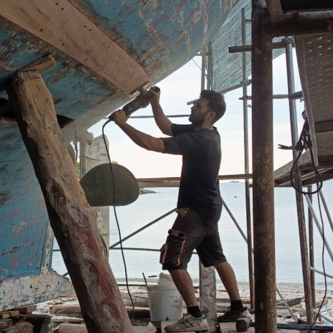 Εκεί, ανάμεσα σε φρεσκοβαμμένα σκαριά και εργαλεία με χρόνια χρήσης πάνω τους, συναντά κανείς τον Τζανή Καραμπά. Στα 30 του χρόνια, είναι ο μοναδικός στην πόλη που συνεχίζει την τέχνη του καραβομαραγκού. Ξεκίνησε παιδί, από τα καλοκαίρια που ακολουθούσε τον πατέρα του, τον Παναγιώτη, στο καρνάγιο και μαθήτευε δίπλα στους «παλιούς». Από τα 16 του, πιο συστηματικά. «Ηξερα από τότε ότι δεν ήθελα να σπουδάσω. Ηθελα να δουλέψω εδώ, όπως ο πατέρας μου και ο παππούς μου». Πήγε φαντάρος και μόλις γύρισε, ξεκίνησε αμέσως τη δουλειά.