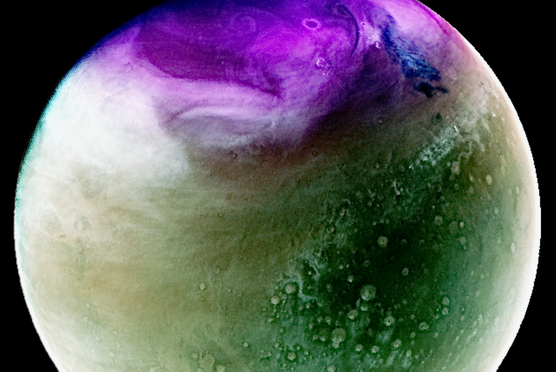 Η λεκάνη Argyre, ένας από τους βαθύτερους κρατήρες του, εμφανίζεται κάτω αριστερά γεμάτη με ατμοσφαιρική ομίχλη, ενώ στο κάτω μέρος διακρίνεται ο νότιος πολικός πάγος.
