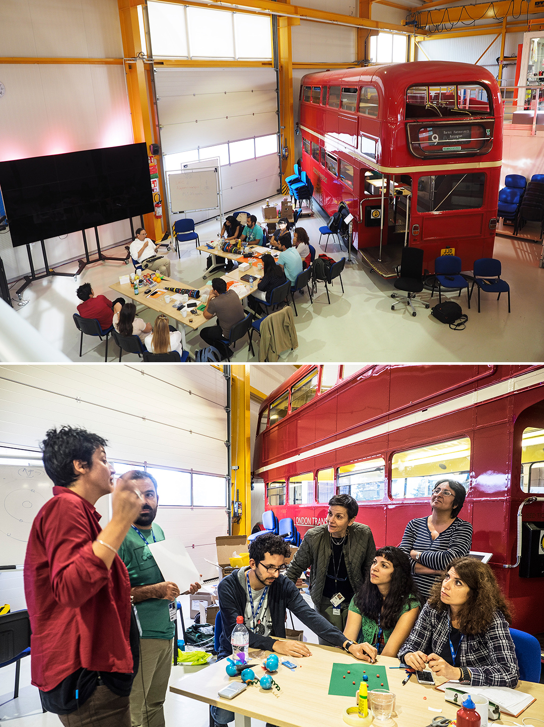 Δίπλα σε ένα κόκκινο βρετανικό διώροφο λεωφορείο, που χώρεσε ολόκληρο στο «IdeaSquare» και μετατράπηκε σε χώρο συναντήσεων, κάθονται στα θρανία του CERN οι Ελληνες δάσκαλοι που πέρασαν από μια διαδικασία επιλογής και αξιολόγησης, όπως παρουσίασε η κυριακάτικη «Κ» σε πρόσφατο ρεπορτάζ (12/6/2016) και προέρχονται από σχολεία νησιωτικών και άλλων περιοχών της Ελλάδας.